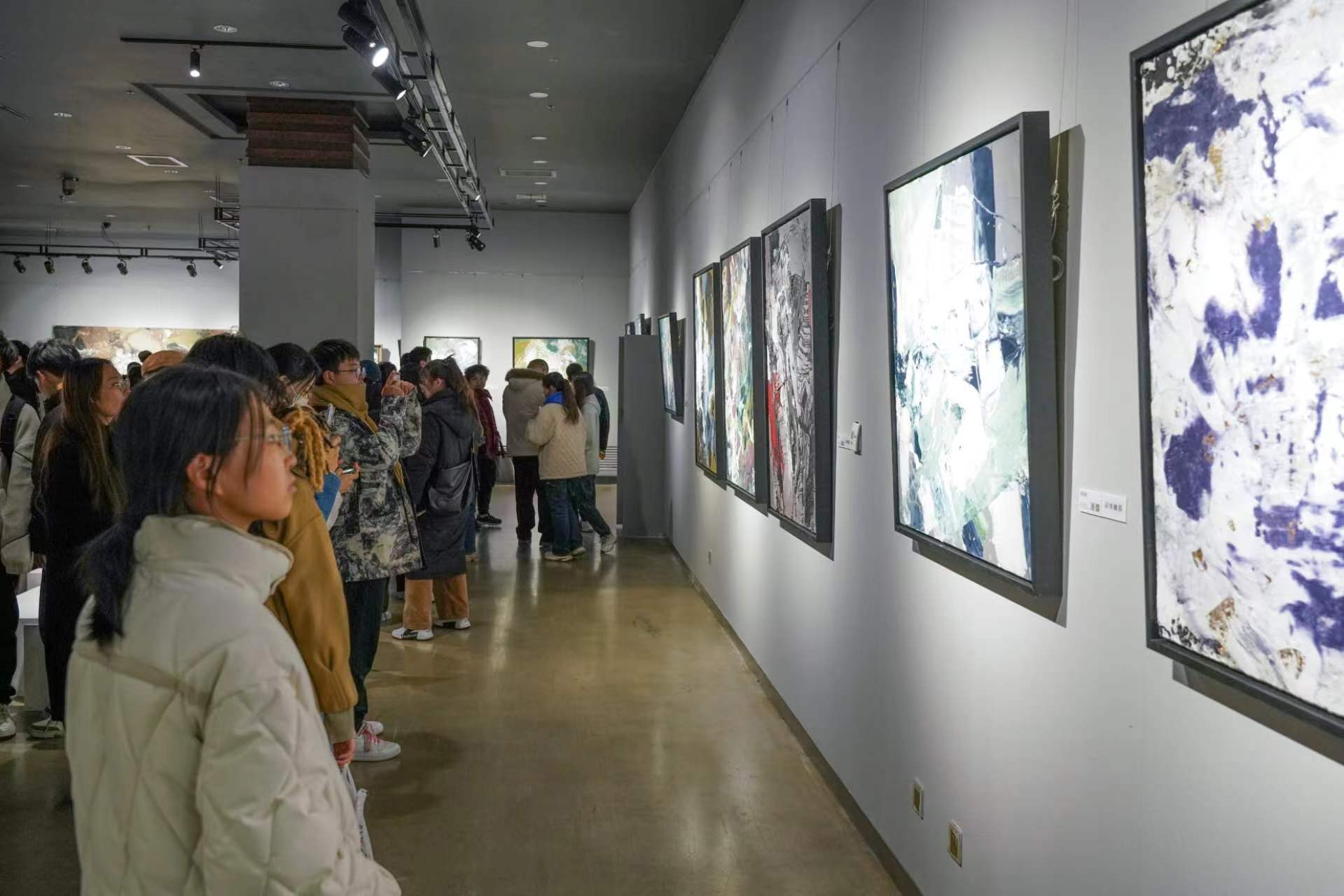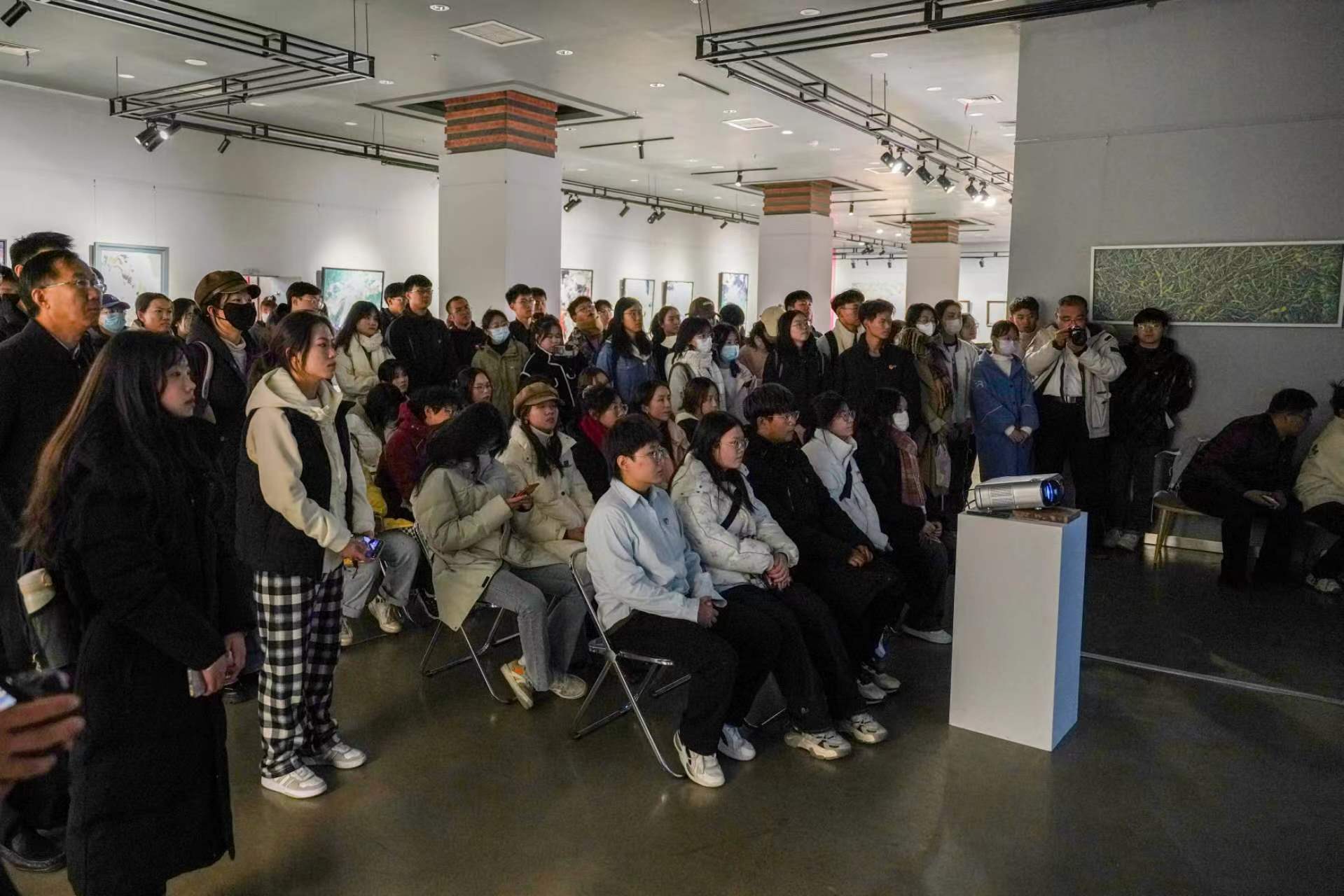 学员们集中观看了艺术家张岩、马丽茵的创作纪实短片及黄河万象空间策展的简介。艺术家张岩现场为学员们逐一介绍了《福佑东方》《山河》《大英雄》《惊涛》等艺术作品的主题思想、创作意图与表现手法,帮助大家理解每一件作品所蕴涵的意义,让每幅作品从抽象中“走出来”,在光影里“活起来”。大家驻足欣赏并认真聆听,对展览作品所反映出的时代性及艺术性赞叹不已。