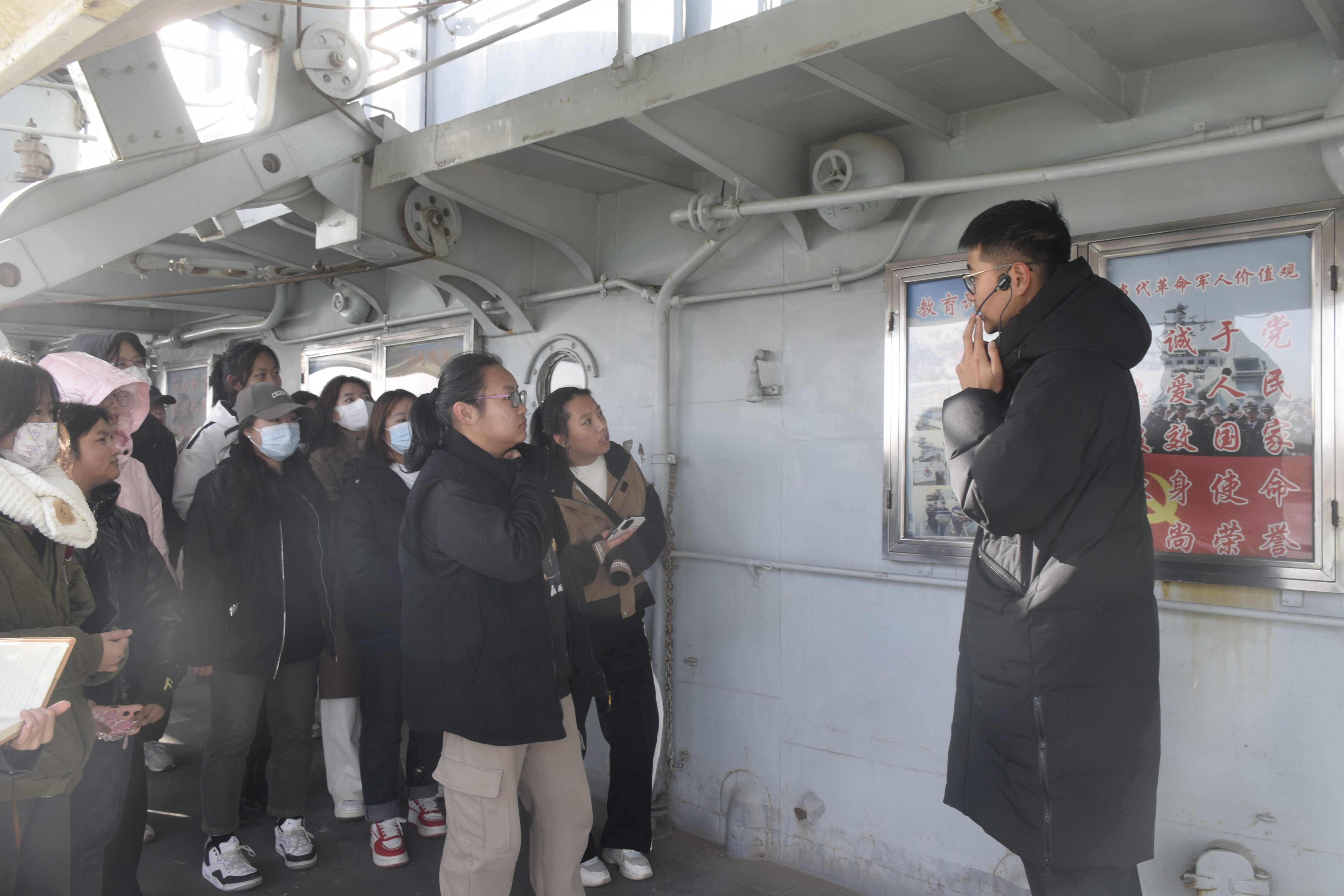 随后师生们跟着讲解员的步伐,有序参观了船舶馆、银川号潜艇及银川舰。通过对一个个设计精良的鱼雷、潜艇和舰船模型的观察,对舰艇上的基本构造有了初步的认识,并进行了生动有趣的潜艇巡航体验,深刻感受到了祖国的伟大富强。