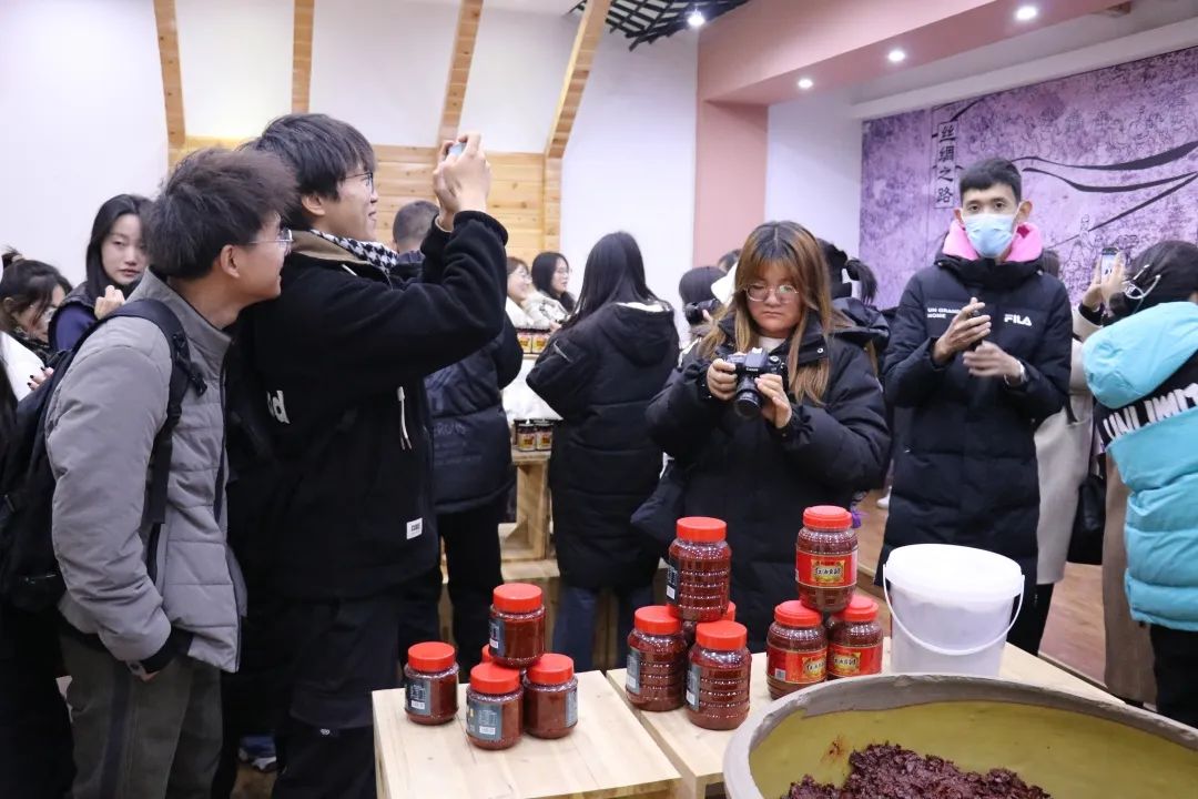 在宁夏红川科技有限公司,同学们参观了红山河食品公司生产线。详细了解辣椒系列农产品的制作、发酵过程以及相关农产品的销售流程。