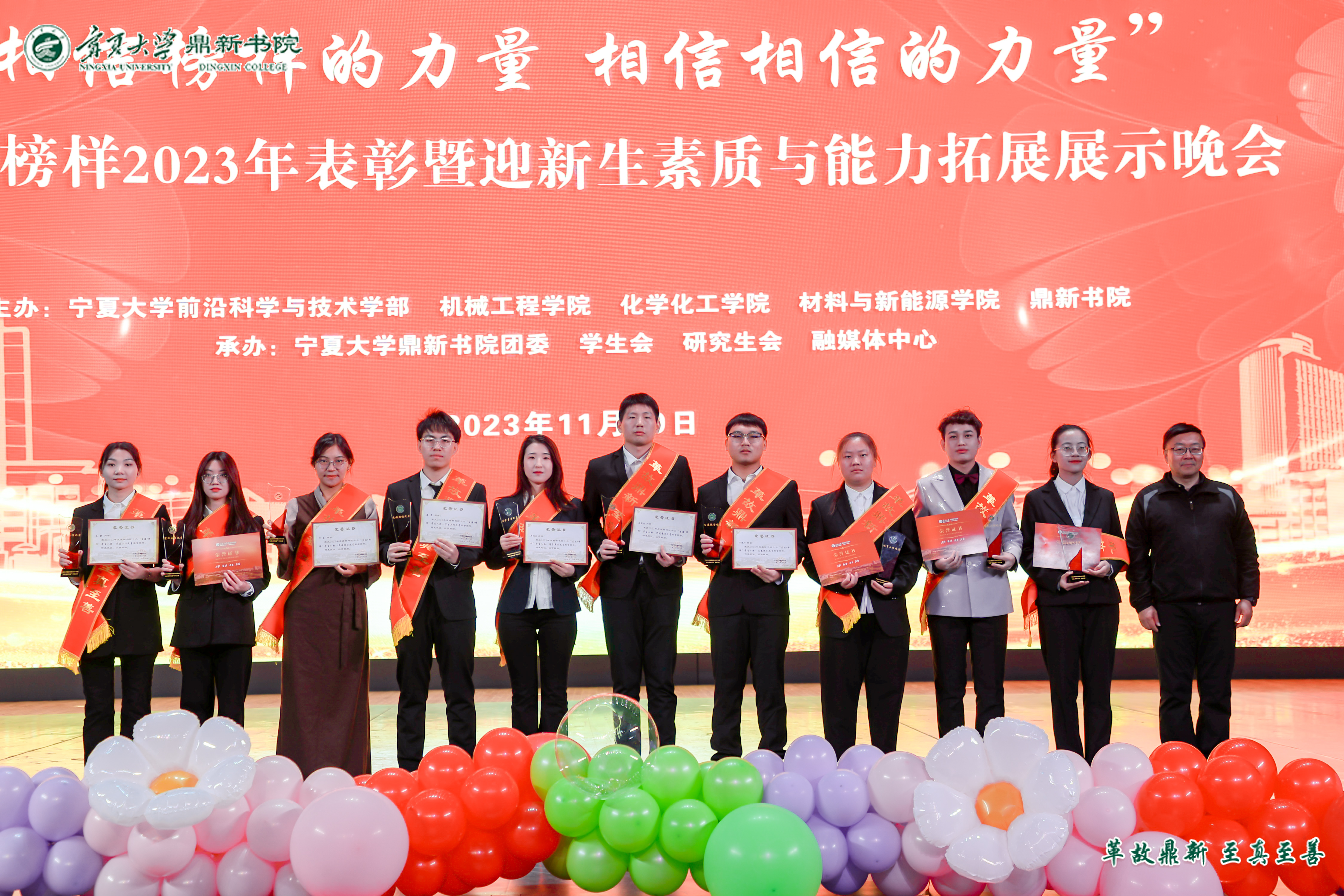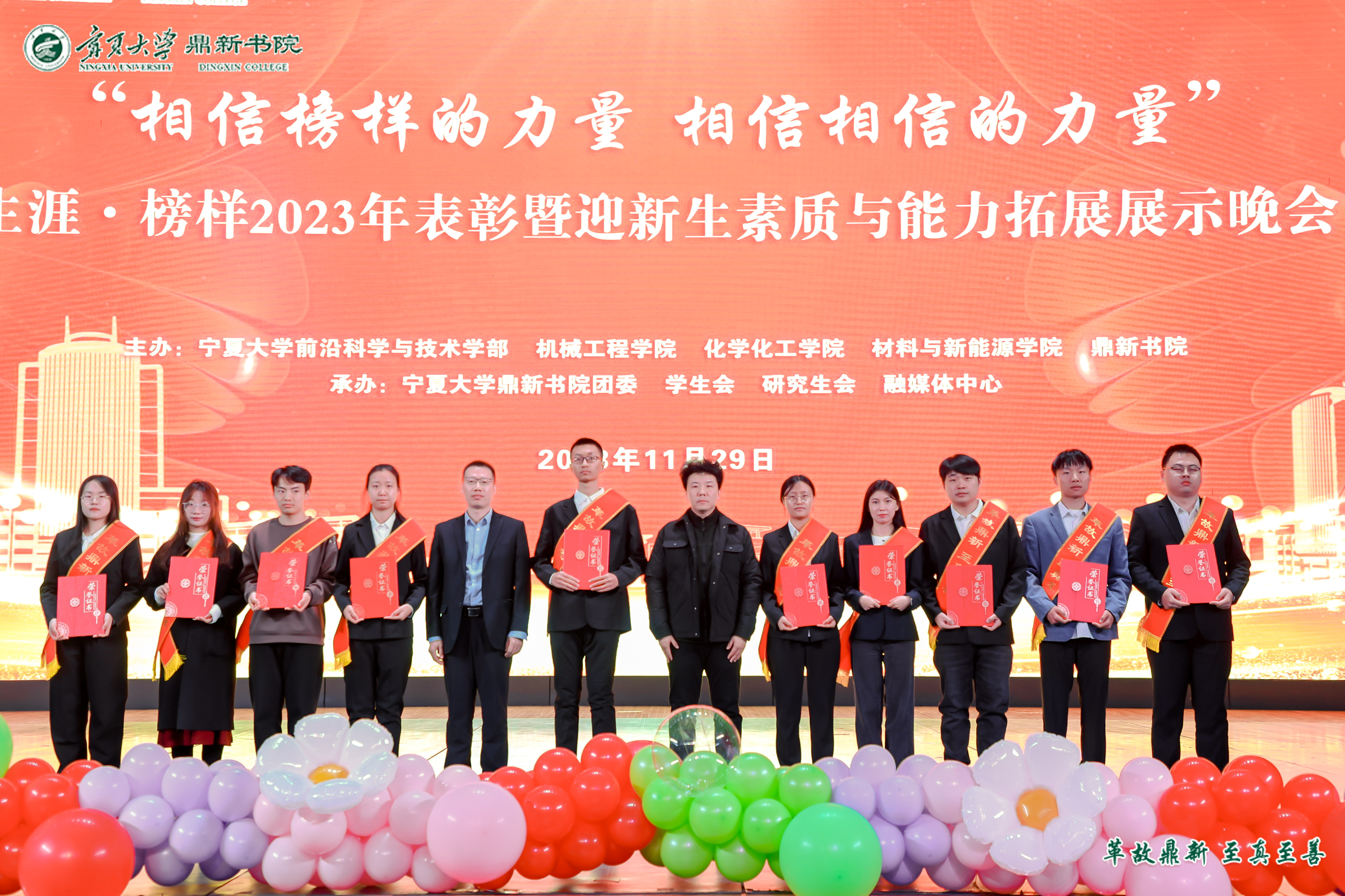 【澳门十大信誉网赌大全新闻中心讯 鼎新书院】为表彰先进典型,弘扬榜样力量,同时为迎接2023级新生,鼎新书院于11月29日晚在文萃校区大学生活动中心举行了2023年“榜样的力量”总结表彰暨迎新生“第二课堂”素质与能力拓展展示晚会。大会诚邀澳门十大信誉网赌大全党委常委、副校长黄河、澳门十大信誉网赌大全共青团书记肖功国、学生处副处长郑轶、机械工程学院党总支书记杨术明、前沿科学与技术学部副部长刘雪冰、化学化工学院党总支副书记李冰、材料与新能源学院副院长王海龙出席,书院全体师生参加活动。大会由鼎新书院党委副书记马丽蓉主持。