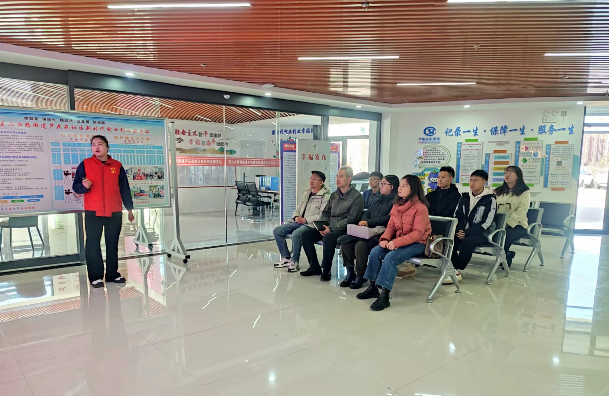 座谈会前,芦花苑社区书记、居委会主任石涛带领与会师生参观社区,讲解了辖区成立及建设历史,展示了芦花苑社区的发展现状,并重点介绍了社区的红色电商基地及老年艺术活动中心,使与会师生清晰直观地了解社区结构及特点。