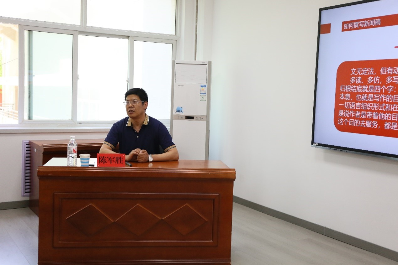 陈军胜以“如何撰写新闻稿”为主题,从新闻构建、美工设计与插图以及公文格式等方面深入浅出地讲授了作为行政人员应当具备的新闻稿件撰写、拍摄以及公文写作技能。大家认真聆听、受益匪浅。