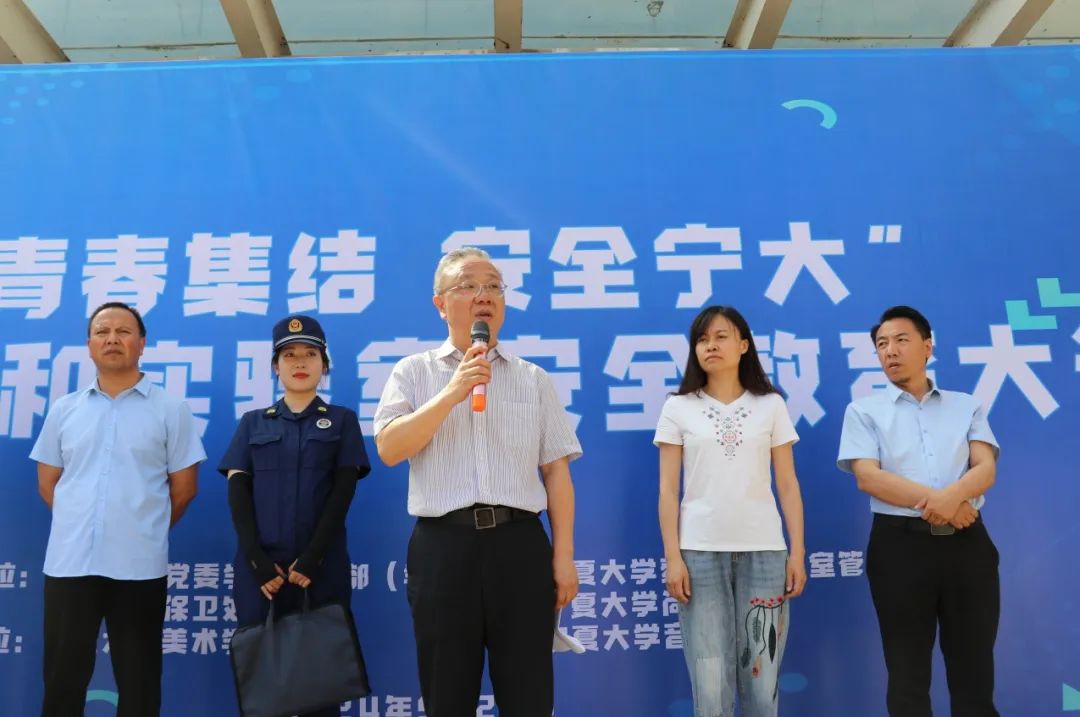 国家安全及实验室安全教育大课堂启动仪式在美术学院楼前举行。资产与实验室管理处处长朱学军、学生处副处长阿利•热合买提、保卫处副处长丁大勇、哲学与艺术学部党委书记李海燕、美术学院院长王胜泽、尚德书院对应四个学院的实验员以及300名学生参加了启动仪式。尚德书院党委书记、院长潘瑞主持仪式。