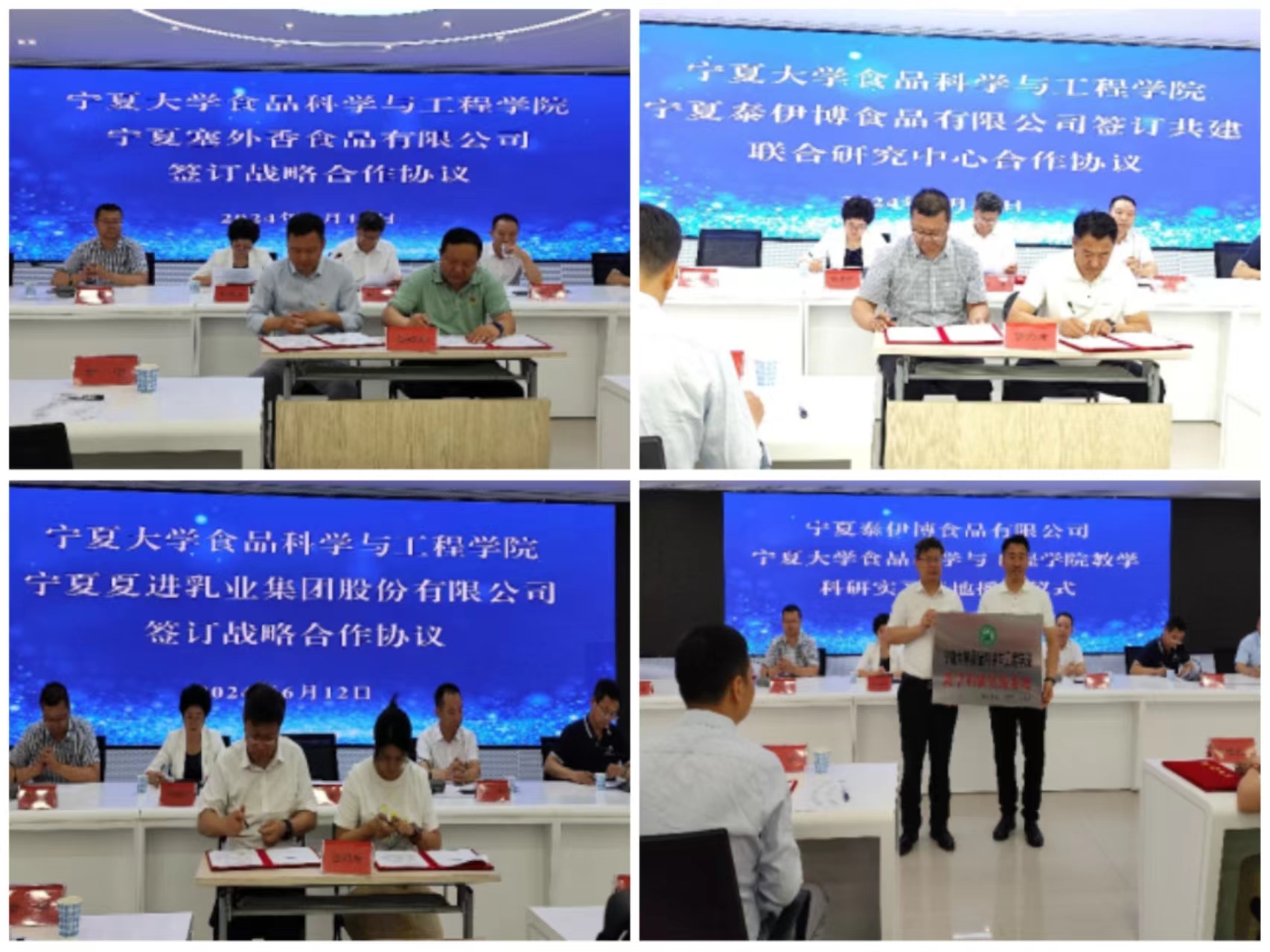会议现场,刘源向宁夏泰伊博食品有限公司授予“澳门十大信誉网赌大全食品科学与工程学院教学科研实习基地”牌匾,并与陈华签订了战略合作协议;宁夏夏进乳业集团股份有限公司项目主管吴红军、宁夏塞外香食品有限公司副总经理刘自斌,分别代表企业与刘源、章中教授签署了校企战略合作协议,宁夏泰伊博食品有限公司总经理吴怀兵与方海田副院长签订了“全谷物烘焙先进发酵技术联合研究中心”共建合作协议。签约仪式后,夏进乳业项目主管、塞外香副总经理和泰伊博公司负责人分别进行了发言,介绍了企业的发展及与食品学院在校企合作方面的情况,并就深入展开校企合作,提高学院学生的实践创新能力,推动企业科技创新,实现双方合作共赢表达了强烈的意愿。
