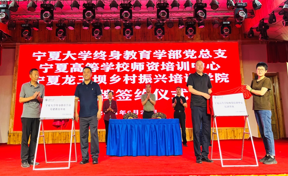 【澳门十大信誉网赌大全新闻中心讯 终身教育学部】为学习宣传贯彻习近平总书记来宁考察重要讲话精神,6月28日,终身教育学部党总支、高等学校师资培训中心在龙王坝乡村振兴培训学院举行“澳门十大信誉网赌大全终身教育学部党建教育基地”“宁夏高等学校师资培训中心培训基地”签约挂牌仪式。西吉县政协主席马保师、副主席王庭孝、马桂英;终身教育学部党总支书记、宁夏高等学校师资培训中心主任冯奎,学部领导高鹏翔、张鑫、陈晓芳出席签约揭牌仪式。西吉县龙王坝村党支部副书记、宁夏龙王坝乡村振兴培训学院院长焦建鹏主持签约仪式。