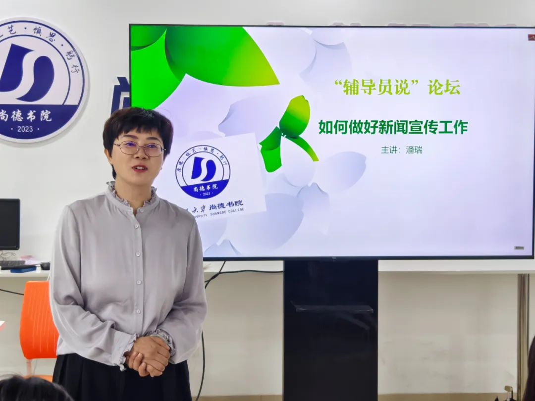 潘瑞以“辅导员如何做好新闻宣传工作”为主题,围绕新闻宣传工作的主要内容、如何修改新闻稿、如何带学生记者和辅导员基本素养提升四个方面展开经验分享。她对新闻工作的“三审三校”制度、意识形态把关责任进行了重点讲解,对书院网站、微信公众号、视频号的维护体制及经验进行了分享。她从具体一篇新闻稿为例,详细解读新闻的简洁性、时效性和政治性。