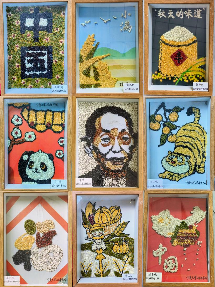 五谷画又称“五谷粮食画”,是传承很久的民间艺术,寓意着国泰民安、五谷丰登。金黄的稻谷、五彩的豆子......在农科同学们的巧思和巧手下,被拼成一幅幅美丽的图案,也展示了农科专业的特色,有的描绘广袤的田野麦浪,有的表达对袁隆平院士的崇高敬意,有的抒发对伟大祖国的无限热爱,有的展现了对红船精神的传承……