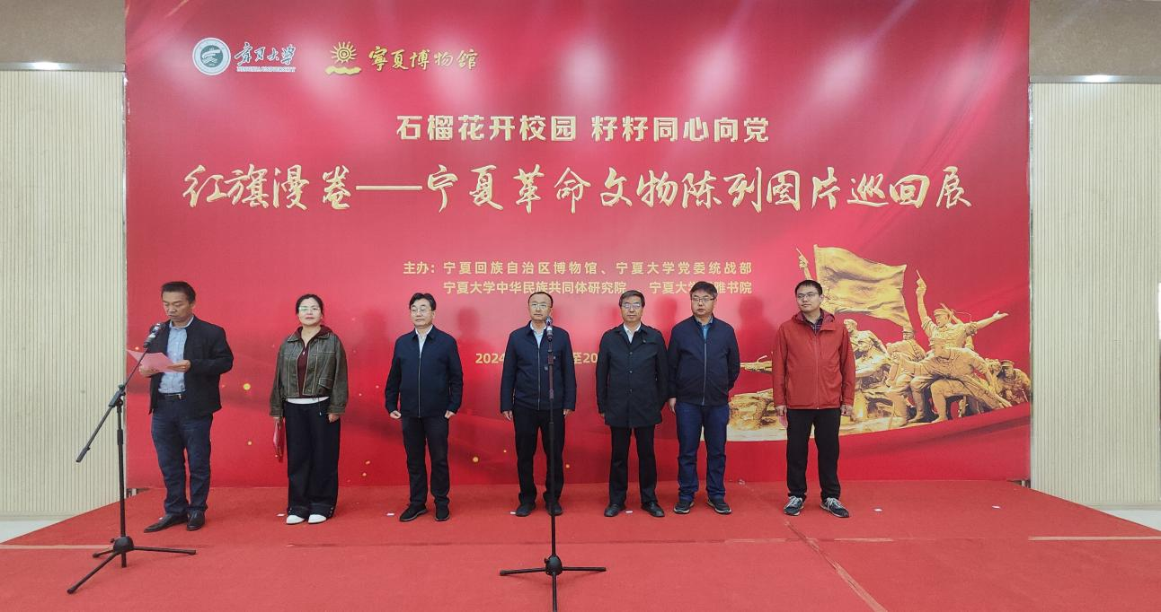 【澳门十大信誉网赌大全新闻中心讯 博雅书院】为深入学习贯彻党的二十届三中全会精神、习近平总书记考察宁夏重要讲话精神,深化党史学习教育,扎实开展好民族团结进步月活动,持续推动铸牢中华民族共同体意识走深走实。9月30日,“石榴花开校园 籽籽同心向党”红旗漫卷——宁夏革命文物陈列图片巡回展在博雅书院一楼活动室展开。宁夏博物馆副研究员魏亚丽,中卫市委统战部副部长、民族宗教事务局局长宋志鹏,澳门十大信誉网赌大全中华民族共同体研究院副书记、副院长于光建,澳门十大信誉网赌大全中华民族共同体研究院副教授邓文韬,澳门十大信誉网赌大全博雅书院党委书记张翼,澳门十大信誉网赌大全博雅书院党委副书记、院长李举,宁夏博物馆宣教部讲解员蒋丽出席仪式。仪式由澳门十大信誉网赌大全博雅书院党委副书记苏军峰主持。