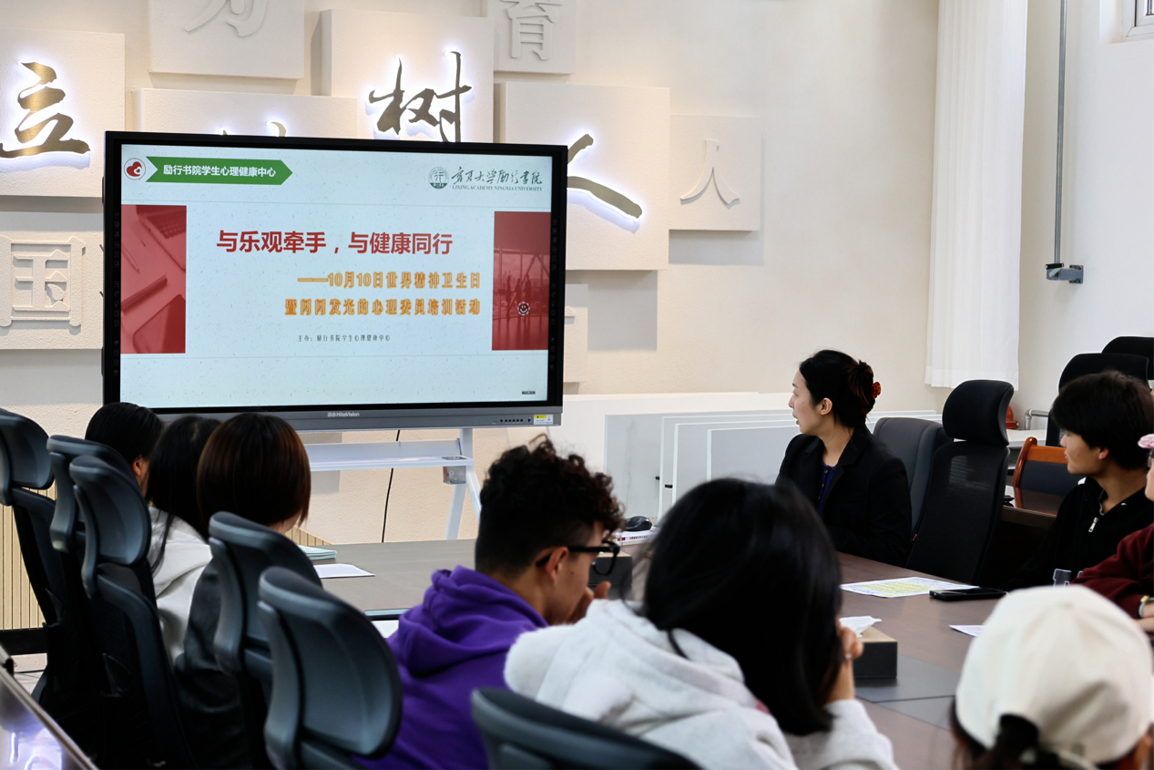 【澳门十大信誉网赌大全新闻中心讯 励行书院】为宣传精神卫生日,普及心理健康知识。10月10日,励行书院开展“与乐观牵手,与健康同行”世界精神卫生日暨“闪闪发光的心理委员”培训会,本次培训会由励行书院学生心理健康中心梁冀宁老师主持,书院2024级全体心理委员参加。