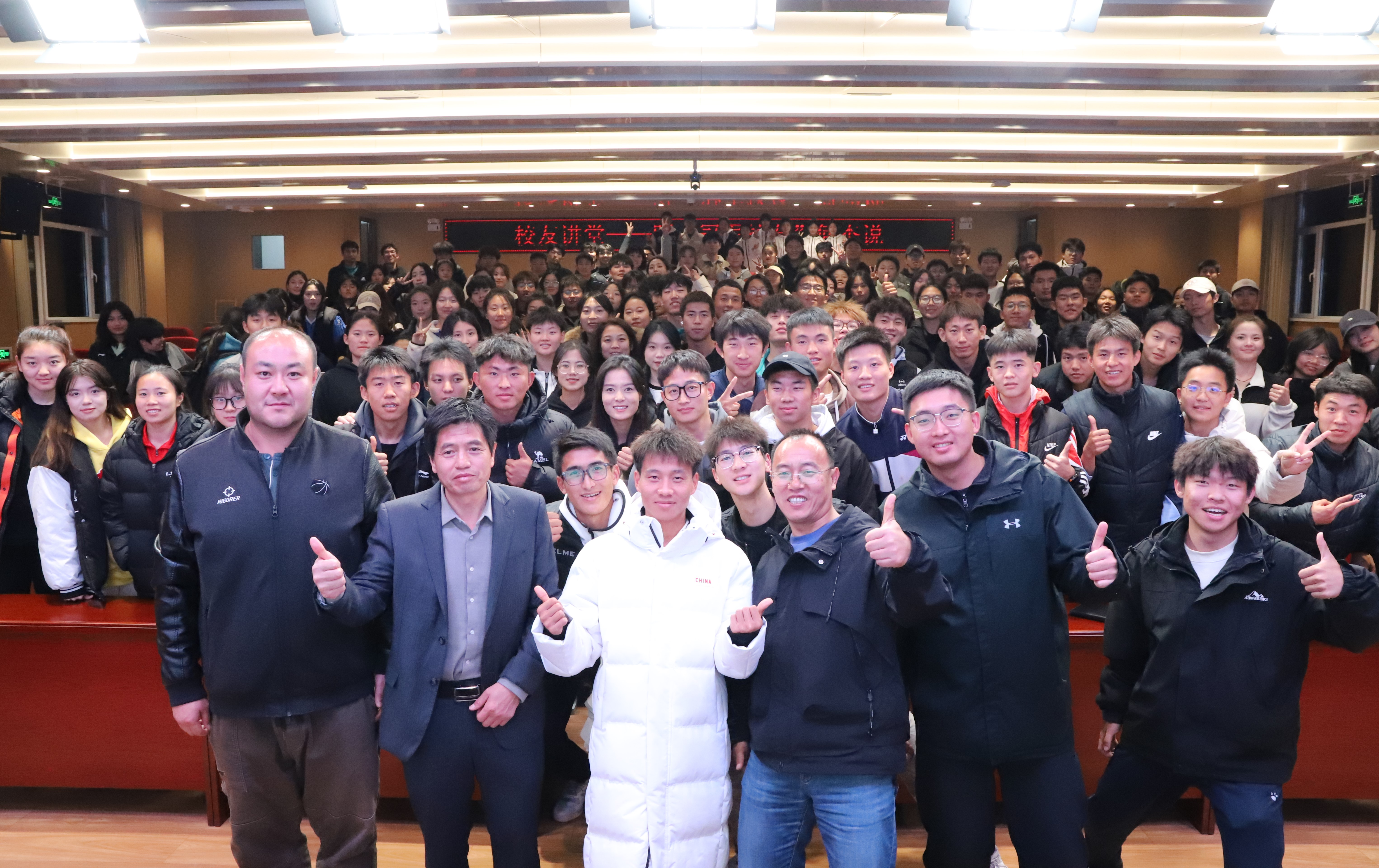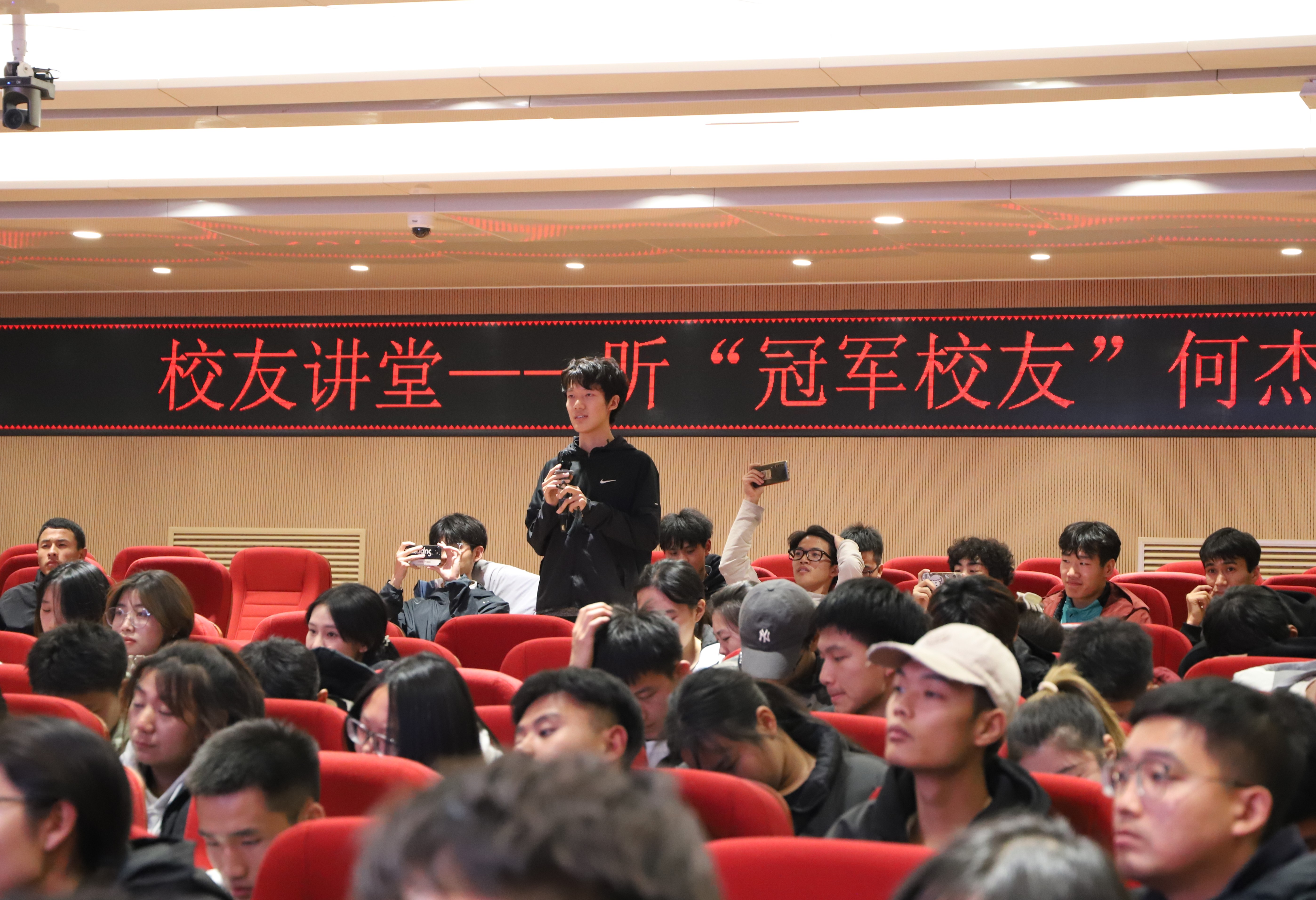 在听众互动环节,何杰认真解答了多位同学的提问。冠军学长以亲身经历为学子们指点迷津,他寄语同学们要“专注纯粹地聆听内心真实的声音”。守正书院副院长彭飞翔指出,何杰在校学习时勤奋好学,今天的体院学子们也当以不待扬鞭自奋蹄的自强精神,坚毅奋进。