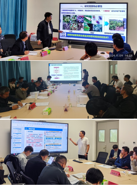 项目负责人苏宝峰教授、贾彦霞教授和王亚麒博士分别汇报了“酿酒葡萄病虫害监测预警关键技术研究与产业化应用”“ 宁夏冷凉地区十字花科蔬菜主要病虫害监测预警及绿色防控关键技术研究与示范”“ 贺兰山东麓酿酒葡萄水肥耦合及水分养分精准调控关键技术研究与示范”的主要研究内容、课题设置、实施方案及考核指标等情况。