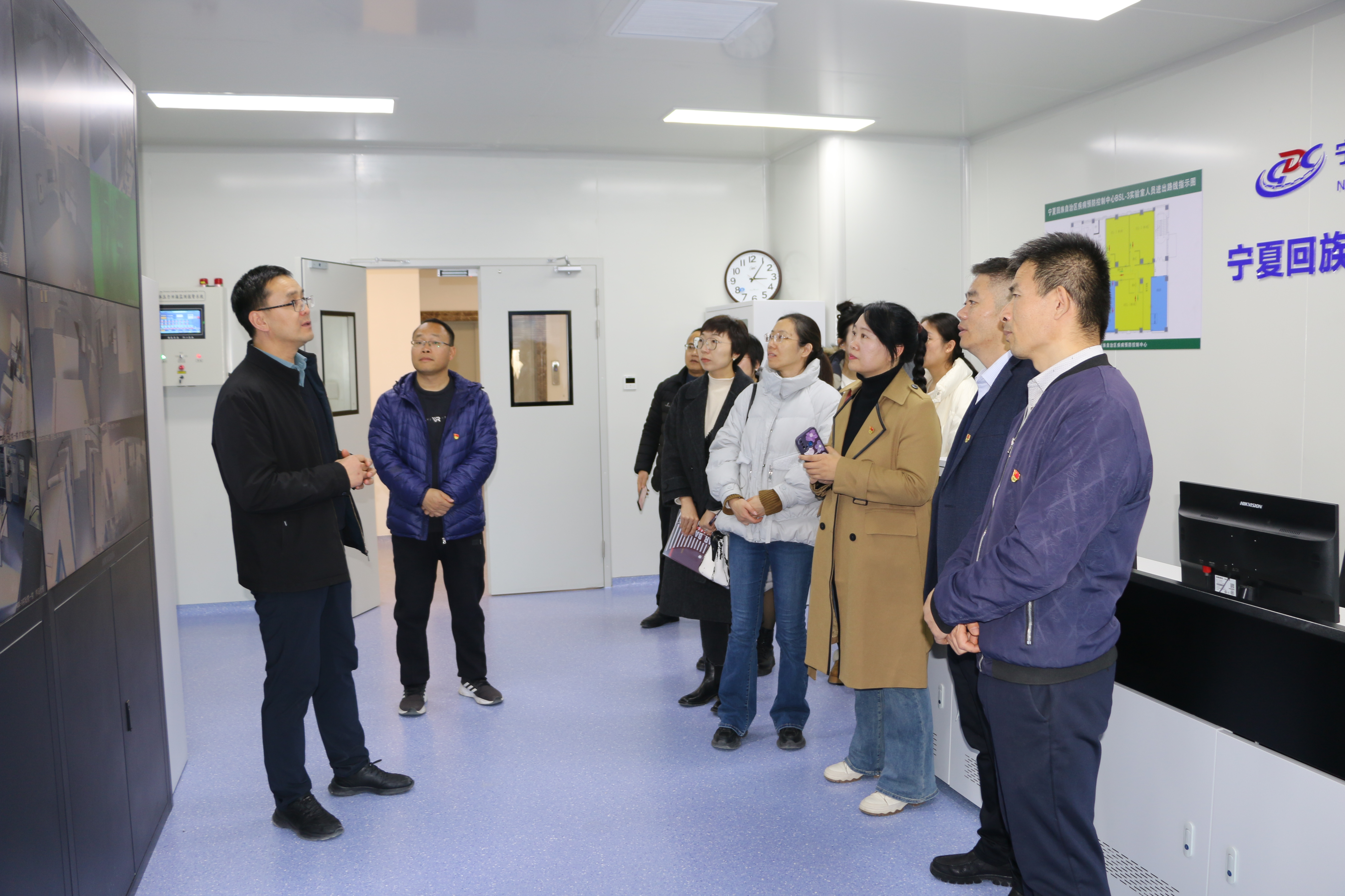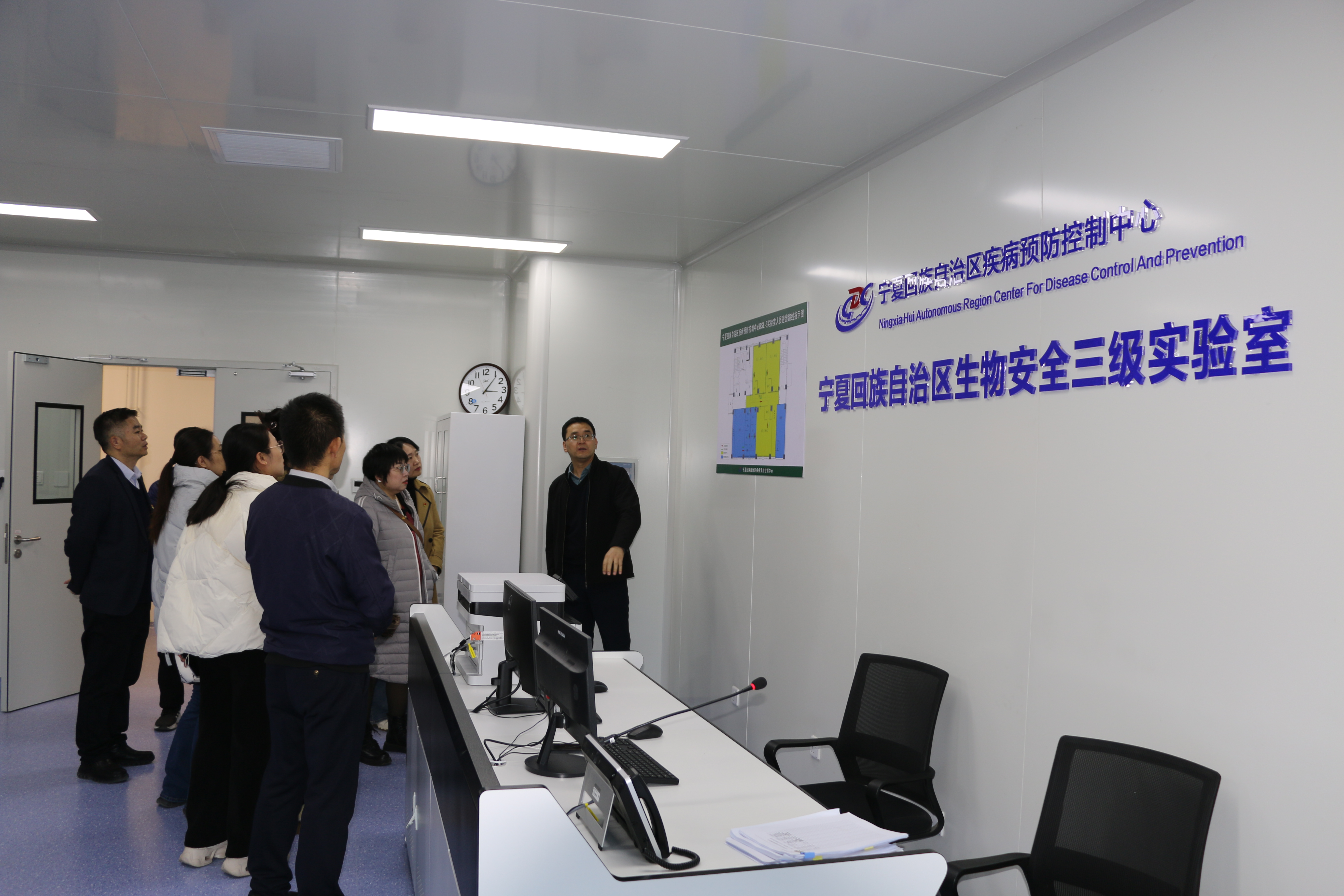 宁夏疾病预防控制中心副主任马学平、检验所副所长马江涛带领大家参观了中心理化实验室、微生物实验室、应急物资库房及智能化冷库,详细介绍了生物安全三级实验室的试运行情况,并就中心检验检测工作、设施设备及人员配备等方面内容进行了座谈交流。