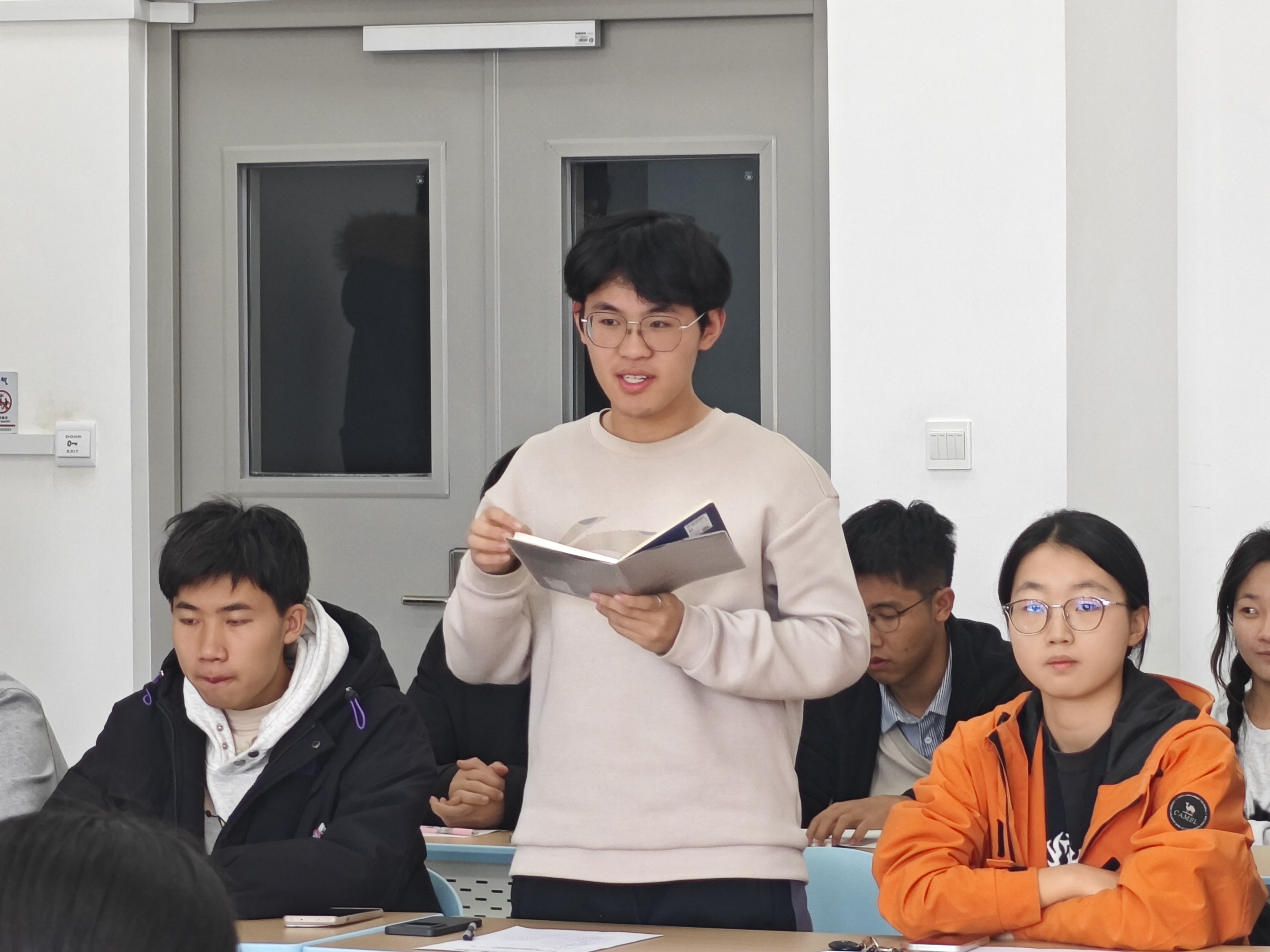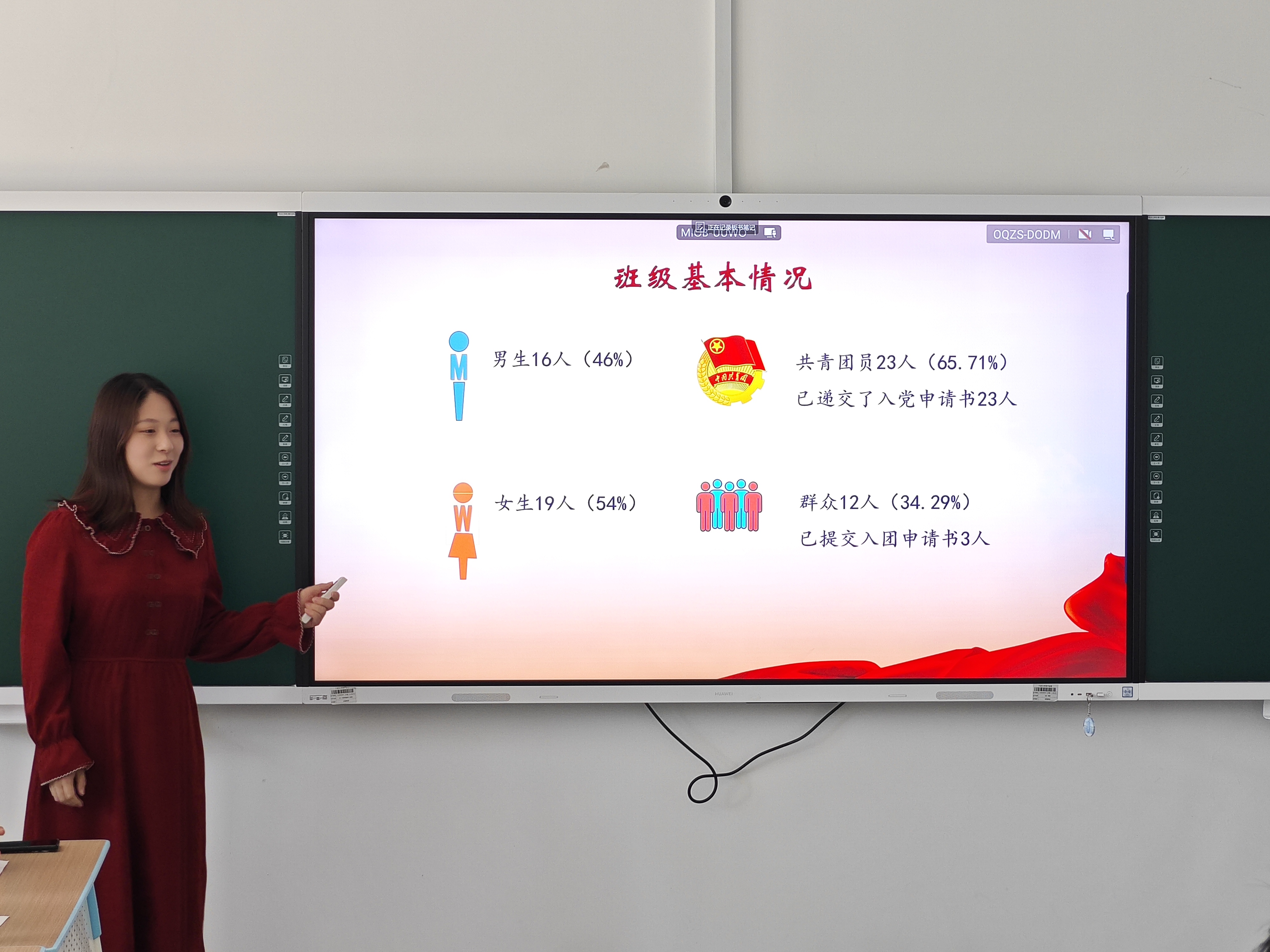 副班长兼团支部副书记田思琦从男女分布、政治面貌、民族分布、生源地分布、入学以来的各类活动参与及表现等方面介绍了班级的基本情况。师生一同观看了《中国青年奔涌向前》视频纪录片,张晓妍、贾悦、赵倩、王雨婷、王佳瑞5位同学围绕主题,结合自身畅谈了对青年担当与时代责任的理解和感悟。