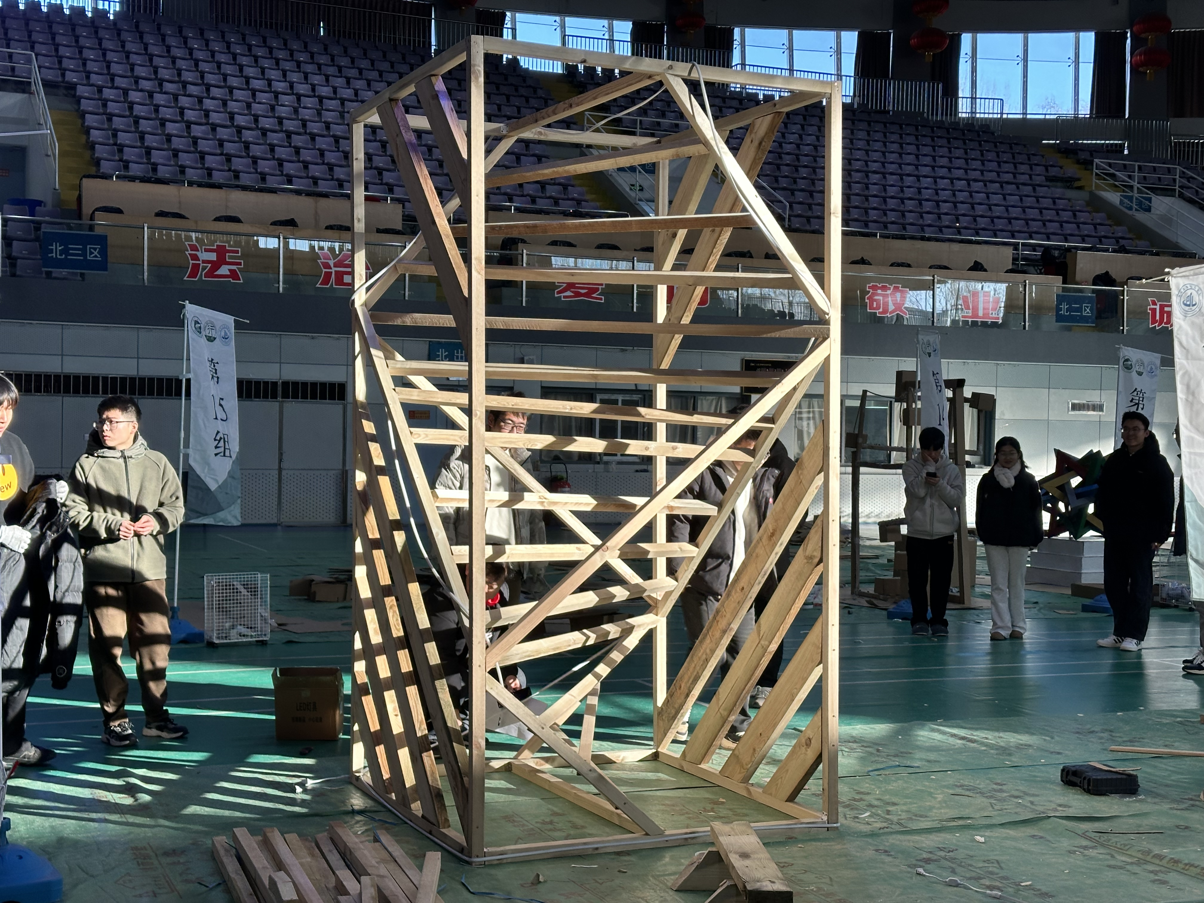 本次比赛以突破传统几何形状的常规组合方式为核心,团队成员紧密协作,构建出具有视觉冲击力和新颖性的作品。专业评审组通过现场观摩、互动提问、公开打分的方式对各小组搭建作品依次点评打分,评出专业组一等奖1项,二等奖2项,三等奖3项,创意组一等奖1项,二等奖1项,三等奖1项。