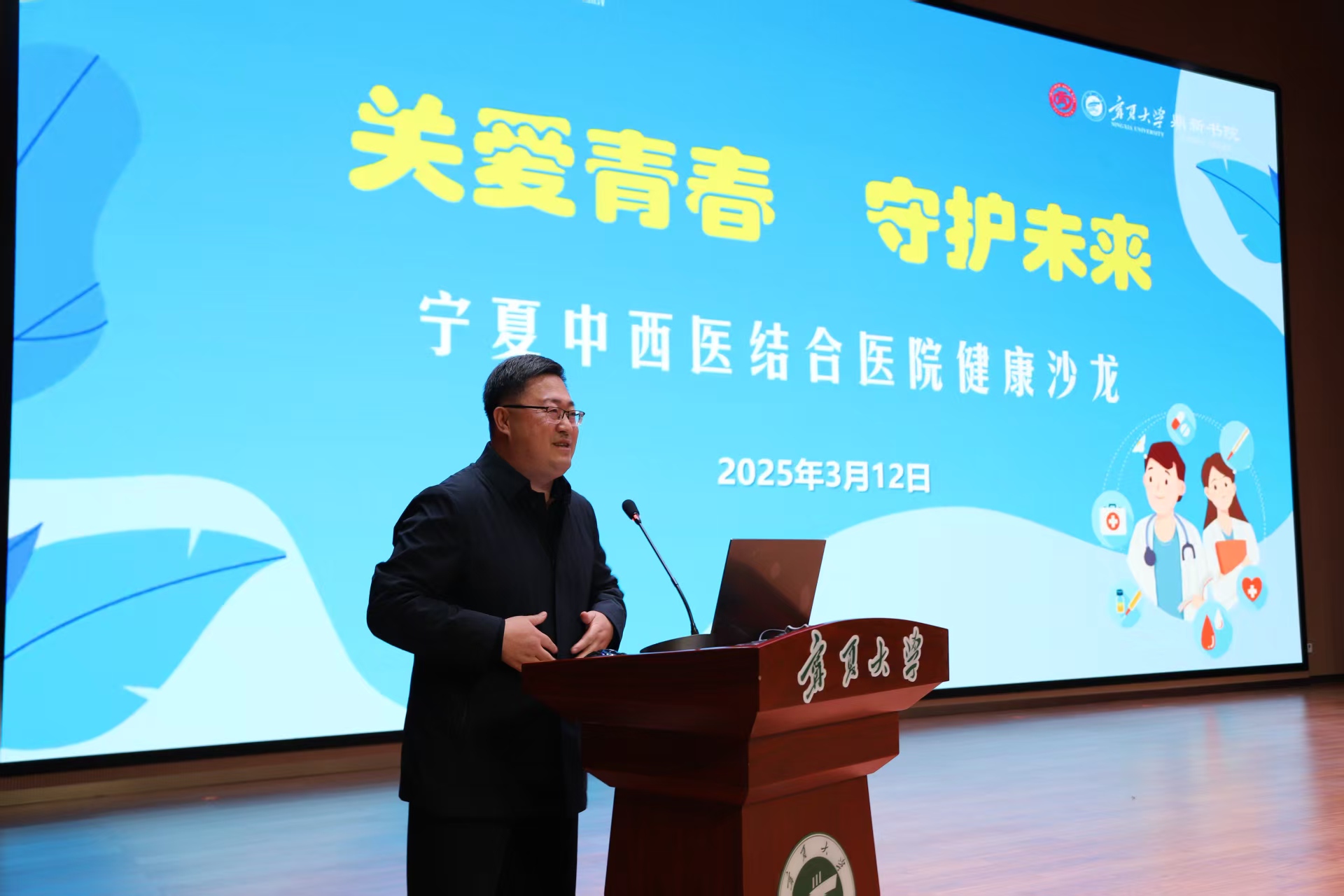 【澳门十大信誉网赌大全新闻中心讯 鼎新书院】为提高师生健康意识,普及科学健康知识,搭建医院与高校间的健康宣教合作平台。3月12日下午,材料与新能源学院、鼎新书院联合宁夏中西医结合医院于贺兰山校区笃行楼一楼报告厅成功举办“关爱青春,守护未来”健康沙龙活动。宁夏中西医结合医院党委书记姬勇,材料与新能源学院党总支书记刘国强,鼎新书院党委书记、院长程胜利,医院有关人员及三百余名同学参加了本次活动,活动由刘国强主持。