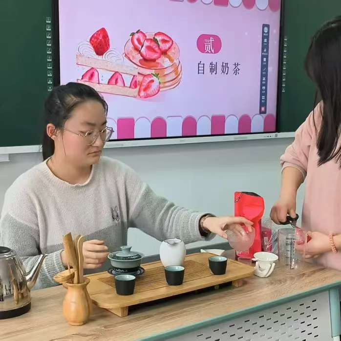 在制作“星空慕斯杯”和蛋糕时,同学们精心调整面包胚形状,细致铺叠酸奶与小料,用色彩斑斓的水果和香脆坚果碎装点,尽显对劳动的认真与对食材的敬重。自制奶茶环节,红茶与牛奶完美交融,简单食材在同学们手中变幻出丰富风味,展现了创意与劳动的结合。