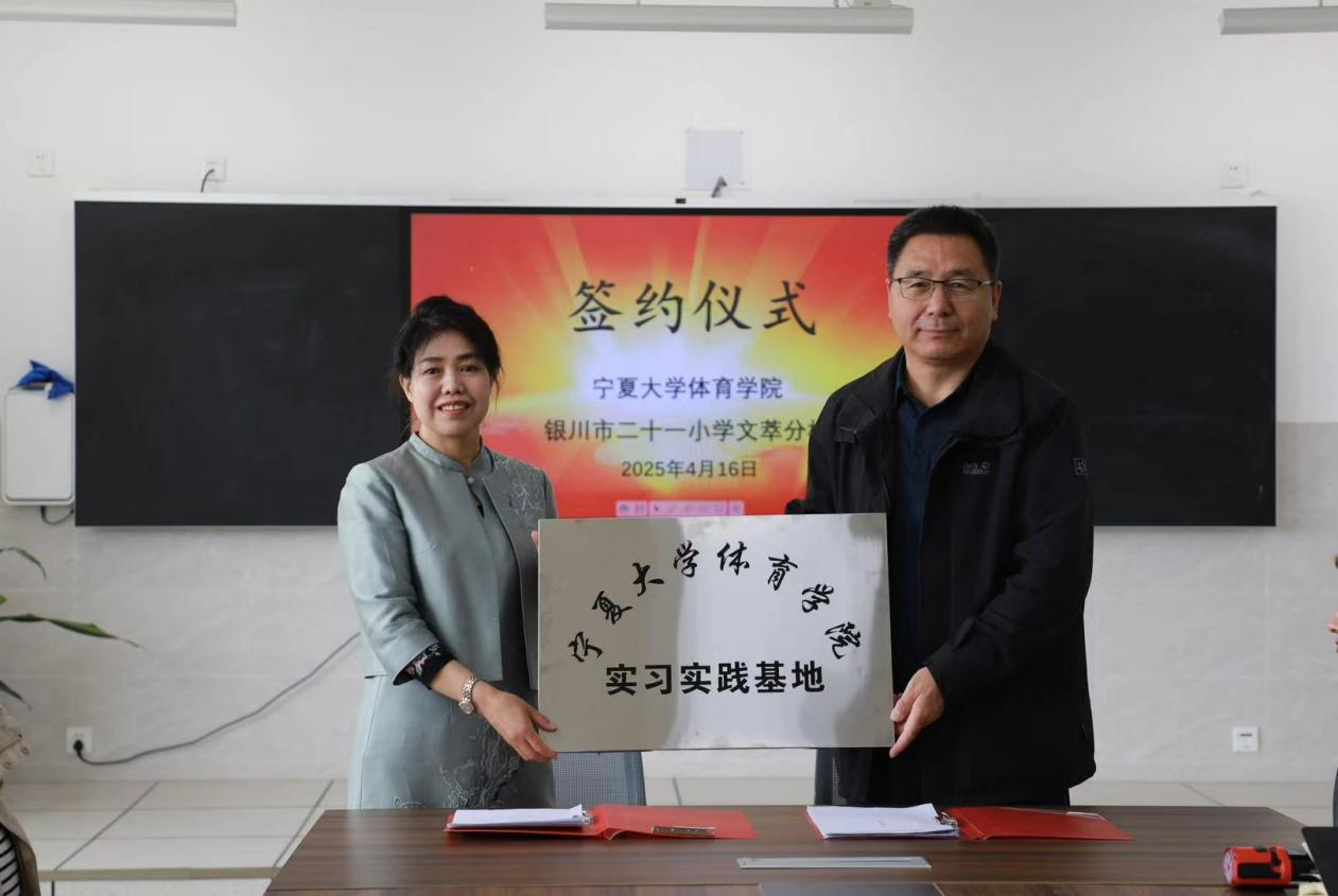 【澳门十大信誉网赌大全新闻中心讯 体育学院】为进一步提高学生专业实践能力,促进高校与中小学协同育人发展,4月16日,信誉网赌体育学院与银川市二十一小学文萃分校正式签署实习实践基地合作协议。签约仪式在银川市二十一小学文萃校区举行,体育学院院长咸云龙、副院长古雅辉、运动训练系主任张志荣、银川市二十一小学文萃分校校长金佩兰等出席了此次签约仪式。