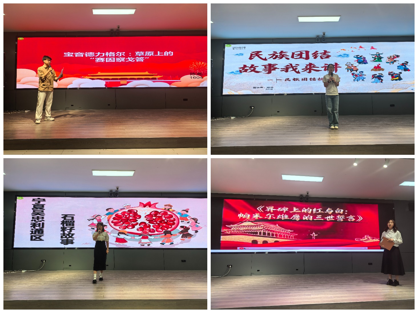 在故事分享环节,35位参赛同学围绕铸牢中华民族共同体意识这一主线,以“身边的民族团结进步故事大家讲”为题,用鲜活的事例、详实的数据、直观的对比,从“三千孤儿入内蒙”“江孜保卫战”“文成公主进藏”“宝音德力格尔:草原上的‘赛因察戈答’”“半条棉被 温暖中国”等一个个真实感人的故事,从不同角度展现了学院师生互帮互助、团结友爱的精神风貌,生动诠释了 “中华民族一家亲,同心共筑中国梦” 的深刻内涵。
