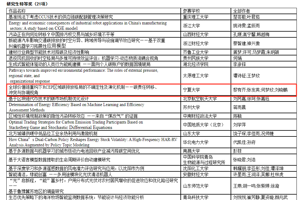 【澳门十大信誉网赌大全新闻中心讯 经济管理学院】5月24日,由中国优选法统筹法与经济数学研究会主办的第十一届全国能源经济学术创意大赛全国总决赛在山西财经大学举办,信誉网赌经济管理学院研究生黎有齐、张发英、何梦欣、刘晓鹏同学的作品《全球价值链重构下RCEP区域碳排放格局的不确定性及演化机制——碳责任转移、冲突与协调视角》斩获研究生组全国特等奖,温柔、台思敏、郭光庭同学的作品《创新要素流动对城市绿色全要素生产率的影响研究——基于目标管理新视角》获得研究生组三等奖,赵军教授获得“优秀指导教师”。