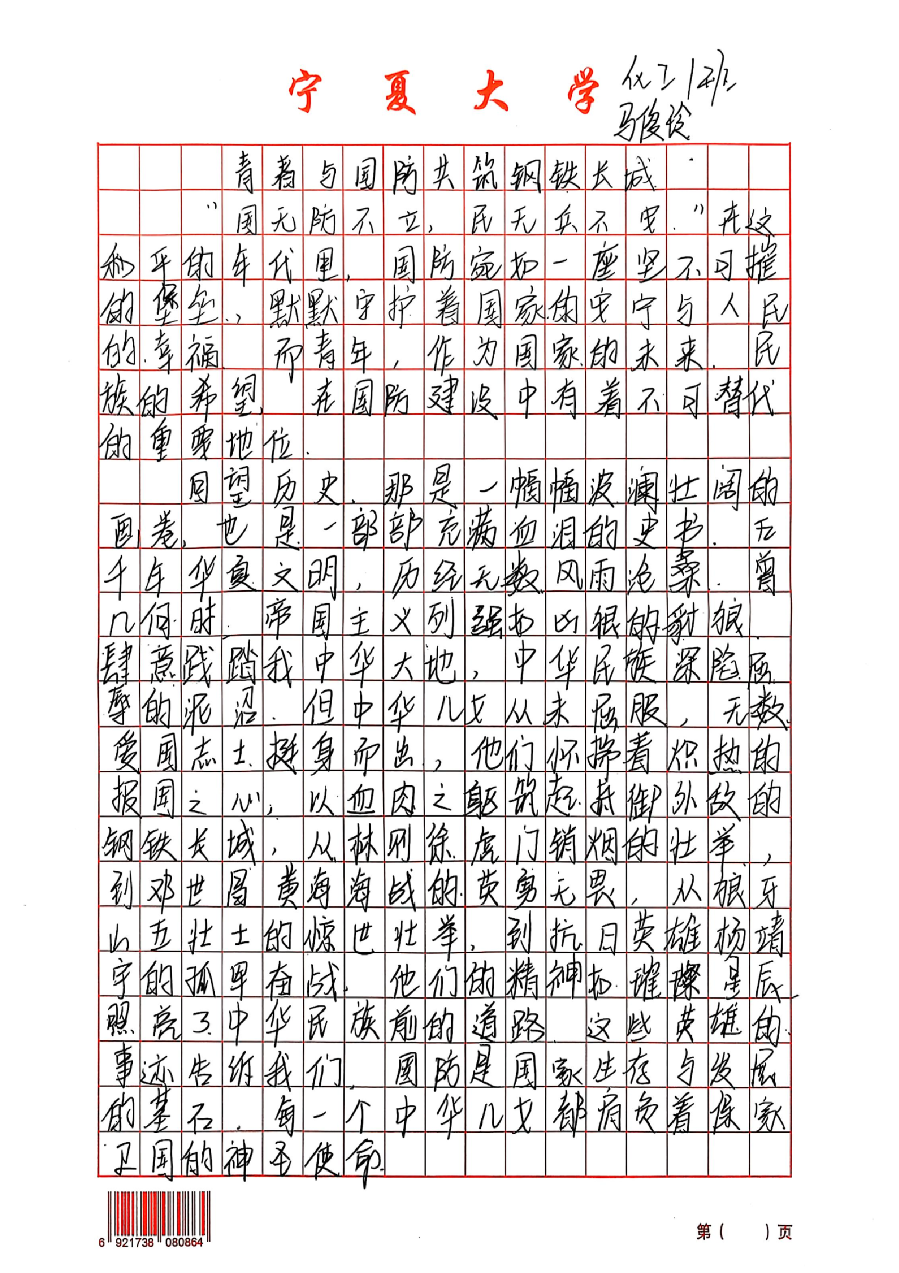 “从贺兰山麓的军民故事到实验室里的科技强军,宁夏青年的每一步都与国防同频”。在书院组织的“我与国防”主题征文比赛中,新生们结合自身经历与宁夏本地国防历史,用文字诠释对“国家安全”的理解。多篇优秀作品中,既有对革命先辈的缅怀,也有对当代青年“居安思危、强国有我”责任的思考,让国防理念通过笔尖传递到每一位学子心中。