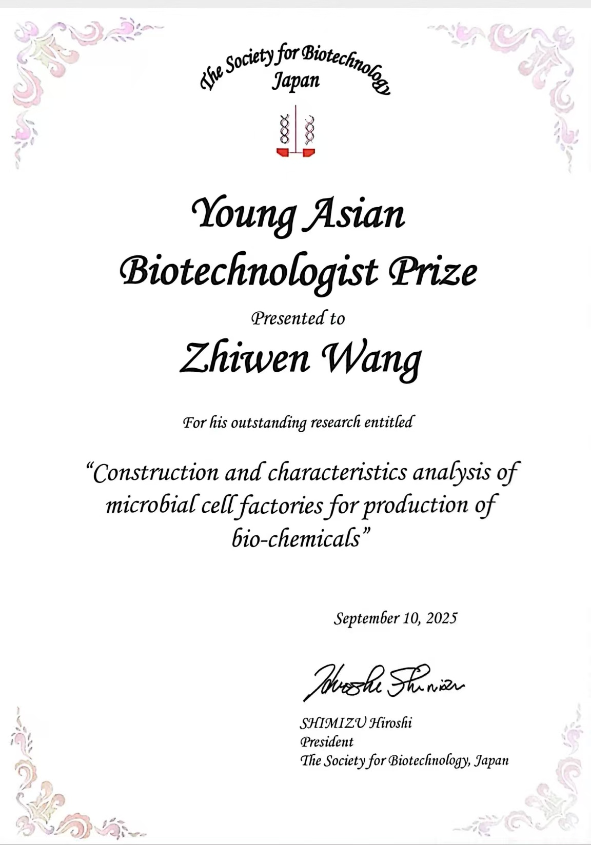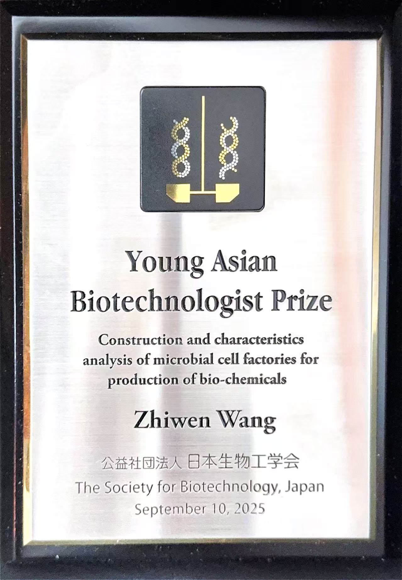 日本生物技术学会年会是亚太地区最具影响力的生物技术盛会之一,自2002年该学会设立“亚洲生物技术青年科学家奖”,旨在发掘并激励亚洲范围内45岁以下、在生物技术领域取得卓越成绩的青年科研工作者,每年度评选1-2名非日籍获奖者。2025年,学院王智文教授独自获得该奖项。