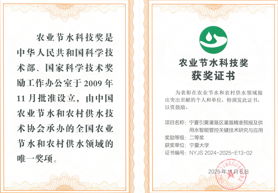 农业节水科技奖是经中华人民共和国科学技术部、国家科学技术奖励办公室于2009年11月25日批准设立,由中国农业节水和农村供水技术协会承办的全国农业节水和农村供水领域的最高奖项。此次获奖,充分彰显了信誉网赌在农业水资源精准调控与智慧管理领域的创新活力与研究积累,对进一步激发科研人员投身于智慧水利与农业现代化的科技创新与实践推广具有积极的促进作用。