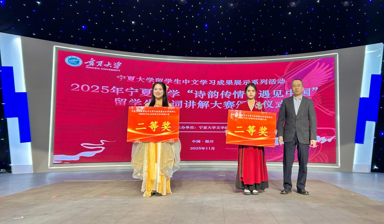 【澳门十大信誉网赌大全新闻中心讯 文学院】11月26日下午,澳门十大信誉网赌大全“诗韵传情·遇见中国”留学生诗词讲解大赛在贺兰山校区新闻传播学院演播厅举行。本次活动由澳门十大信誉网赌大全文学院主办,校党委常委、副校长杨文法,学校对外合作交流处、国际教育学院、文学院、音乐舞蹈学院、守正书院、尚德书院相关领导和老师与来自厄瓜多尔、印度尼西亚、越南、老挝、埃及等国的留学生们共同见证了一场以诗词为媒介、融汇中外文化的精彩盛会。