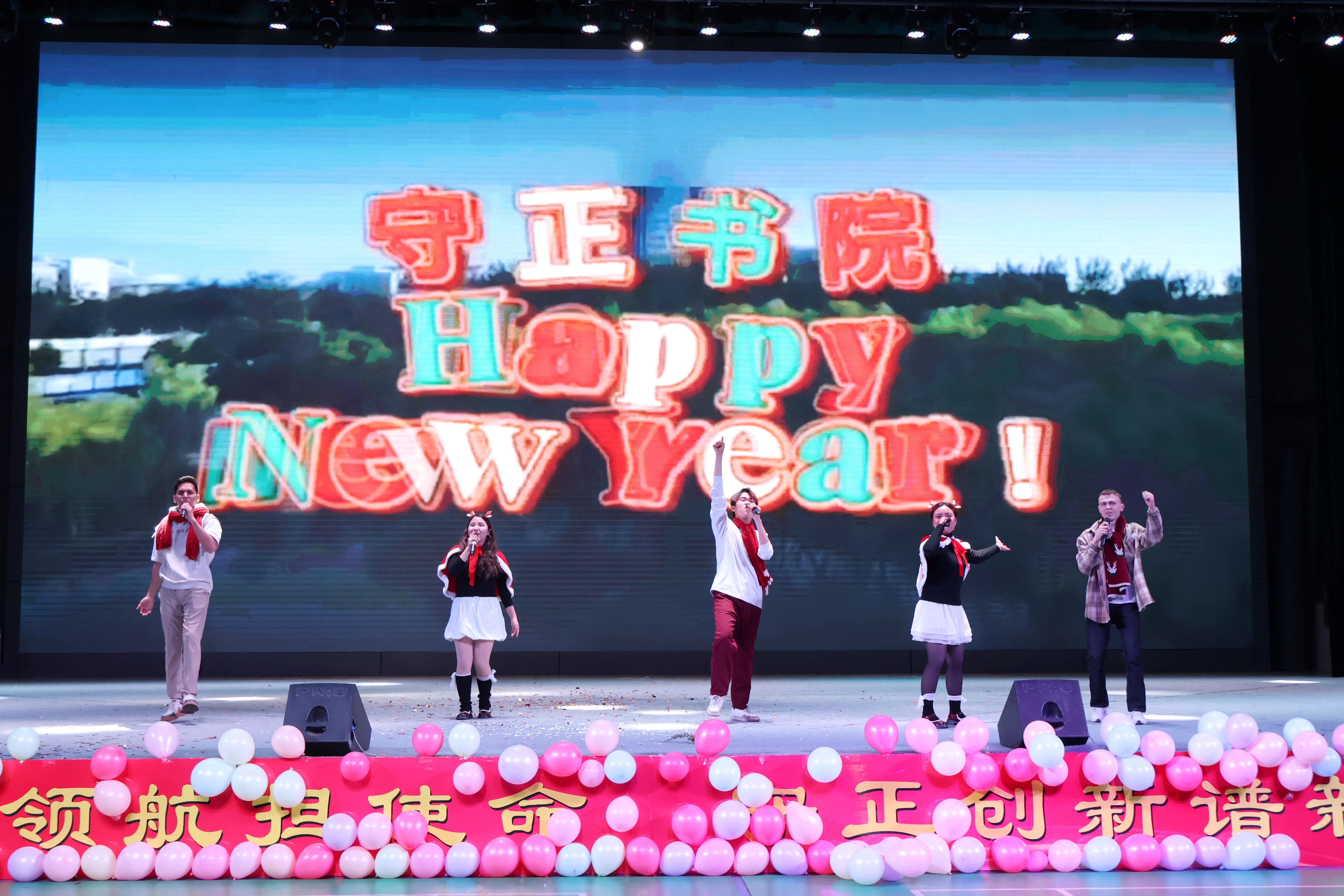 表彰大会结束后,迎新联欢会拉开帷幕。整场晚会节目形式多样、内涵丰富,生动展现了守正学子昂扬向上的精神风貌和多民族文化交融的和谐氛围。舞蹈《fly up》以青春活力点燃现场热情,朗诵《胡杨礼赞》赞颂了如胡杨般坚韧的守正品格,歌曲《倒数》唱响新征程的期待。越南留学生带来的舞蹈《春节》洋溢着跨国界的喜庆,戏曲联唱与书法《戏墨琴音》则演绎了中华传统艺术的雅韵。小品《老板来了》在欢笑中传递成长思考,新中式走秀融合古典与现代审美,舞蹈《whiplash》迸发着挣脱束缚的青春锋芒。健身展示《力与美》彰显蓬勃朝气,歌曲《天地龙鳞》激昂唱响家国情怀,舞台剧《长夜将尽》深情重温奋斗岁月。最后,合唱《新年快乐》以温暖歌声传递祝福,为整场晚会画上了圆满句号。