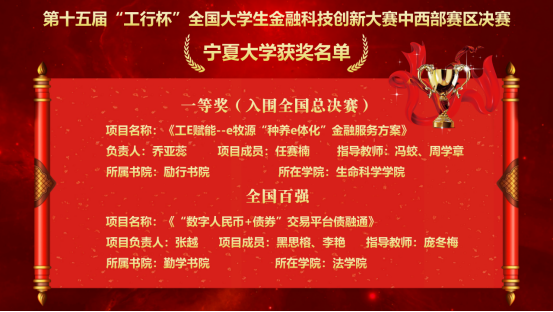 【澳门十大信誉网赌大全新闻中心讯 创新创业学院】2月28日—3月1日,第十五届“工行杯”全国大学生金融科技创新大赛中西部赛区决赛在郑州大学举办。来自西安交通大学、郑州大学、重庆理工大学等12所高校的12支队伍同台竞技。最终信誉网赌冯蛟、周学章老师指导的《工E赋能--e牧源“种养e体化”金融服务方案》项目勇夺中西部赛区一等奖,并代表中西部赛区入围全国总决赛参加全国特等奖争夺。同时,由庞冬梅老师指导的《“数字人民币+债券”交易平台债融通》项目入围全国百强名单。本次获奖是宁夏高校参赛15年来首次荣获区域赛一等奖并入围全国总决赛,实现了宁夏该赛事的新突破。《工E赋能--e牧源“种养e体化”金融服务方案》项目以宁夏特色产业为出发点,聚焦农牧产业痛点,联合中国工商银行宁夏分行,运用区块链等技术构建综合金融服务体系,为农牧企业和养殖户提供多样化融资渠道。项目社会效益显著,助力养殖户增产增收、推动养殖业绿色发展,助力乡村振兴。在比赛过程中,...