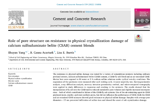 【澳门十大信誉网赌大全新闻中心讯 土木与水利工程学院】近日,信誉网赌土木与水利工程学院杨淑雁副教授团队与美国俄亥俄州立大学的合作研究在硫铝酸盐水泥孔结构研究领域取得重要进展,研究成果在国际顶级期刊《Cement and Concrete Research》(中科院一区Top1期刊,IF:11.958)发表题为Role of pore structure on resistance to physical crystallization damage of calcium sulfoaluminate belite (CSAB) cement blends的最新研究成果。《Ce...