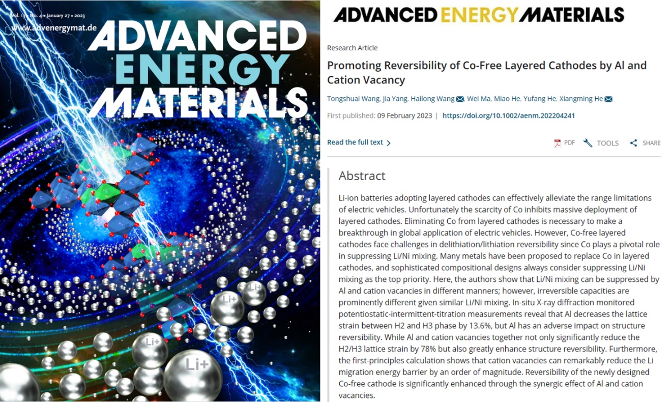【澳门十大信誉网赌大全新闻中心讯 材料与新能源学院】近日,材料与新能源学院王海龙教授团队联合清华大学何向明教授团队在新一代无钴层状正极材料研究领域取得重要突破,工作以“Promoting Reversibility of Co-free Layered Cathodes by Al and Cation Vacancy”为题,以封面文章形式发表在国际能源材料类顶刊《Advanced Energy Materials》(影响因子29.68)《先进能源材料》上。王海龙和何向明为论文共同通讯作者,澳门十大信誉网赌大全研究生王同帅...