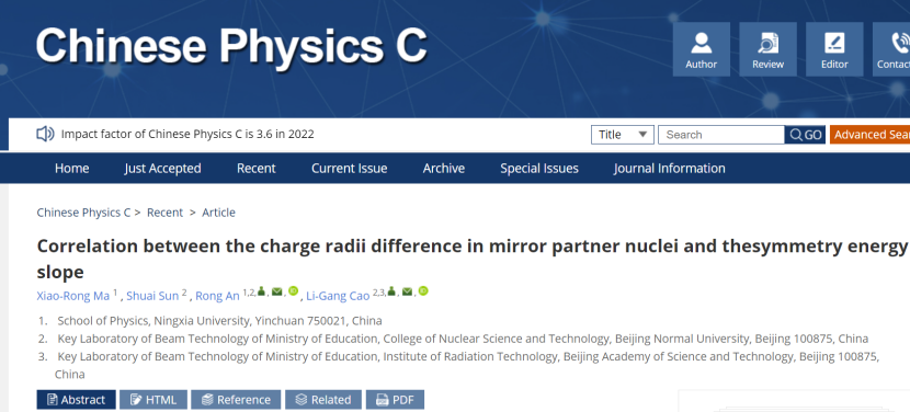 【澳门十大信誉网赌大全新闻中心讯 物理学院】6月13日,物理学院本科生马小荣与北京师范大学博士研究生孙帅、澳门十大信誉网赌大全物理学院安荣博士以及北京师范大学曹李刚教授,在国际学术期刊《Chinese Physics C》上发表题为“Correlation between the charge radii difference in mirror partner nuclei and the symmetry energy slope”的原创论文。文章研究了对关联以及对称核物质不可压缩系数对镜像核电荷半径差值与对称能斜率之间关联性的影响,发现表面对相互作用以及不同的压缩模式都会影响镜像核电荷半径差值与对称能斜率之间的关联性。马小荣为该论文的第一作者,安荣博士为该论文的第一通讯作者,澳门十大信誉网赌大全物理学院为该论文的第一通讯单位。对称能的密度依赖行为是核物理中的前沿课题,对于描述有限核、核物质、中子星以及引力波事件等具有重要的意义。目前对于对称能的密度依赖行为研究尚未形成统一的结论,因此需要通过不同的探测量去限制。研究发现,镜像核电荷半径差...