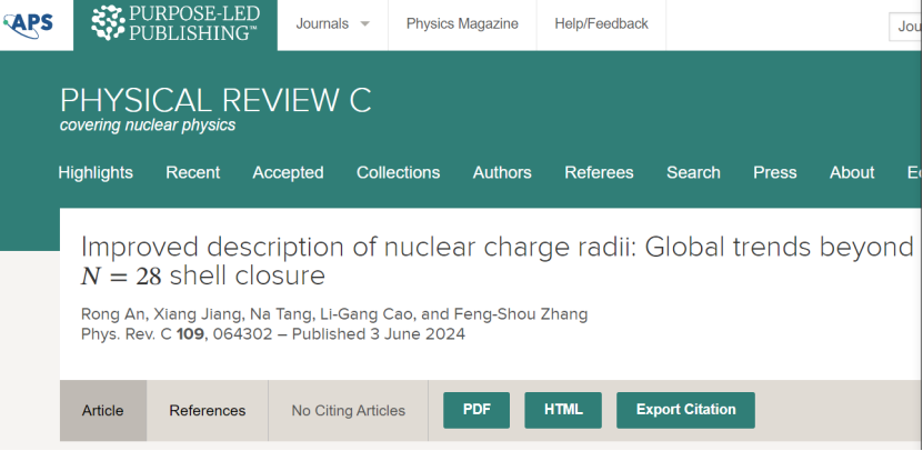 【澳门十大信誉网赌大全新闻中心讯 物理学院】近日,物理学院理论物理组青年教师安荣博士和唐娜博士与深圳大学蒋翔博士、北京师范大学曹李刚教授以及张丰收教授,在美国物理协会权威期刊《Physical Review C》上发表题为《Improved description of nuclear charge radii: Global trends beyond N=28 shell closure》的原创性论文。文章通过引入中子和质子之间的关联性,提出了描述原子核电荷半径变化趋势的较为可靠的方法。文中指出,通过同...