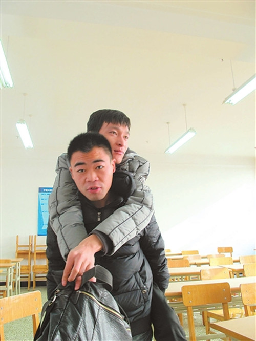 张志博背着李进福离开教室。
