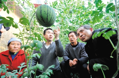 宁夏日报讯(记者 王晓龙 实习生 马 楠/摄)12月7日,贺兰县习岗镇新平现代设施农业示范园区温棚内,澳门十大信誉网赌大全农学院教授李建设(左二)与银川设施农业专家团的张江龙(右一)为农户史克龙(右二)指点吊瓜种植技术。