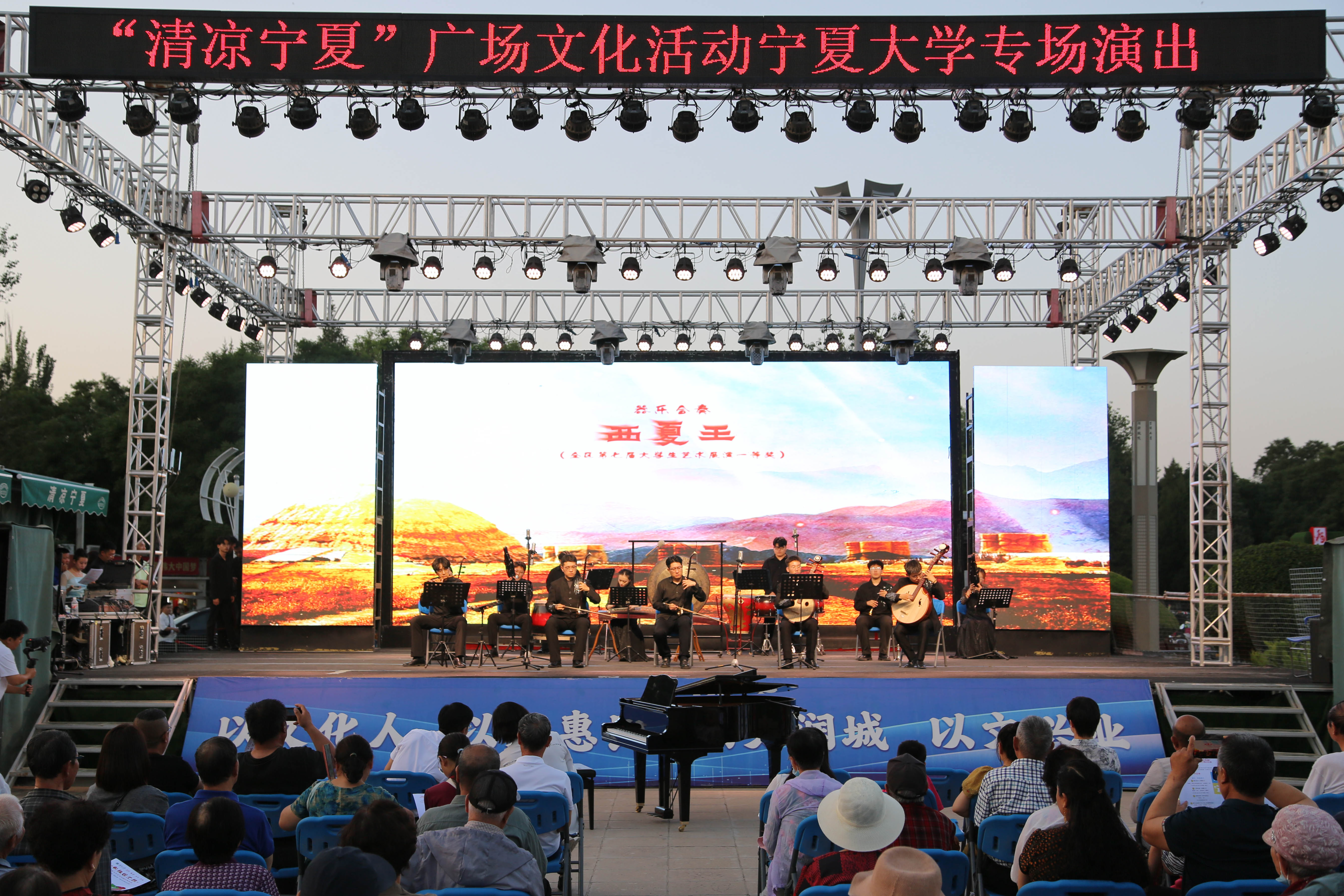 【澳门十大信誉网赌大全新闻中心讯 李明花/文 文轩轩 程博/图】为深入学习贯彻习近平文化思想,喜迎新中国成立75周年,由自治区党委宣传部、文化和旅游厅、财政厅主办,澳门十大信誉网赌大全承办的“向祖国汇报——澳门十大信誉网赌大全艺术实践经典展演”2024年全区“清凉宁夏”澳门十大信誉网赌大全专场文艺汇演于6月14日晚在光明广场精彩上演。校党委副书记韩惠丽,校党委常委、宣传部部长高永兴及音乐学院党政领导与市民一同在现场观看。演出节目形式多样、编排紧凑,分为器乐、朗诵展示,声乐展示,舞蹈展示三个部分,涉及器乐表演、古筝独奏、钢琴独奏、合唱、联唱、独唱、群舞、独舞等丰富多彩的艺术门类。演出在荣获全区第七届大学生艺术展演一等奖的器乐组合《西夏王》的演绎中拉开帷幕。《西夏王》将宁夏地区花儿音乐元素重构运用,以节奏作为描述情绪的表现手段,层层递进、气势磅礴,铿锵有力、婉婉道来的乐器引领现场观众追求中华文化的源远流长。古筝独奏《望秦川》以古朴苍劲的陕西同州梆子为...