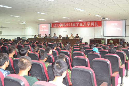 【澳门十大信誉网赌大全新闻中心讯 政法学院】9月18日下午,政法学院2013级新生开学典礼在A区文科楼模拟法庭举行。政法学院党委书记拜发奎、副书记崔明堂、副院长曲正、冯璐璐,等院领导出席了开学典礼,学院全体老师和230名本硕...