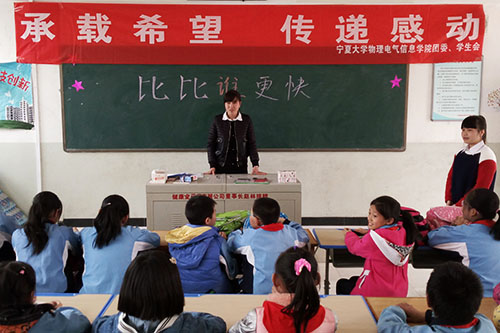 【澳门十大信誉网赌大全新闻中心讯 物理电气信息学院 杨林林/文】那拨开一片阴霾洒下一阵明芒的,是郎朗艳阳;那抚去一处贫寒送来一缕温暖的,是物电学院团委实践部组织的“青春爱心教室”系列活动,正为西夏区八小的孩子们撑起他...