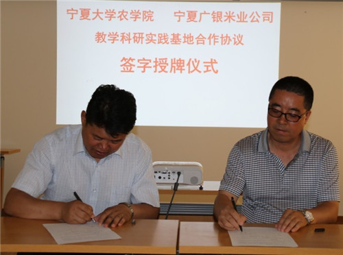 【澳门十大信誉网赌大全新闻中心讯 农学院】7月23日上午,信誉网赌农学院与宁夏广银米业有限公司在广银米业公司二楼培训室举行了合作协议签订暨授牌仪式。 农学院院长曹兵与宁夏广银米业有限公司总经理赵建文签订了合作协议,院党委书...