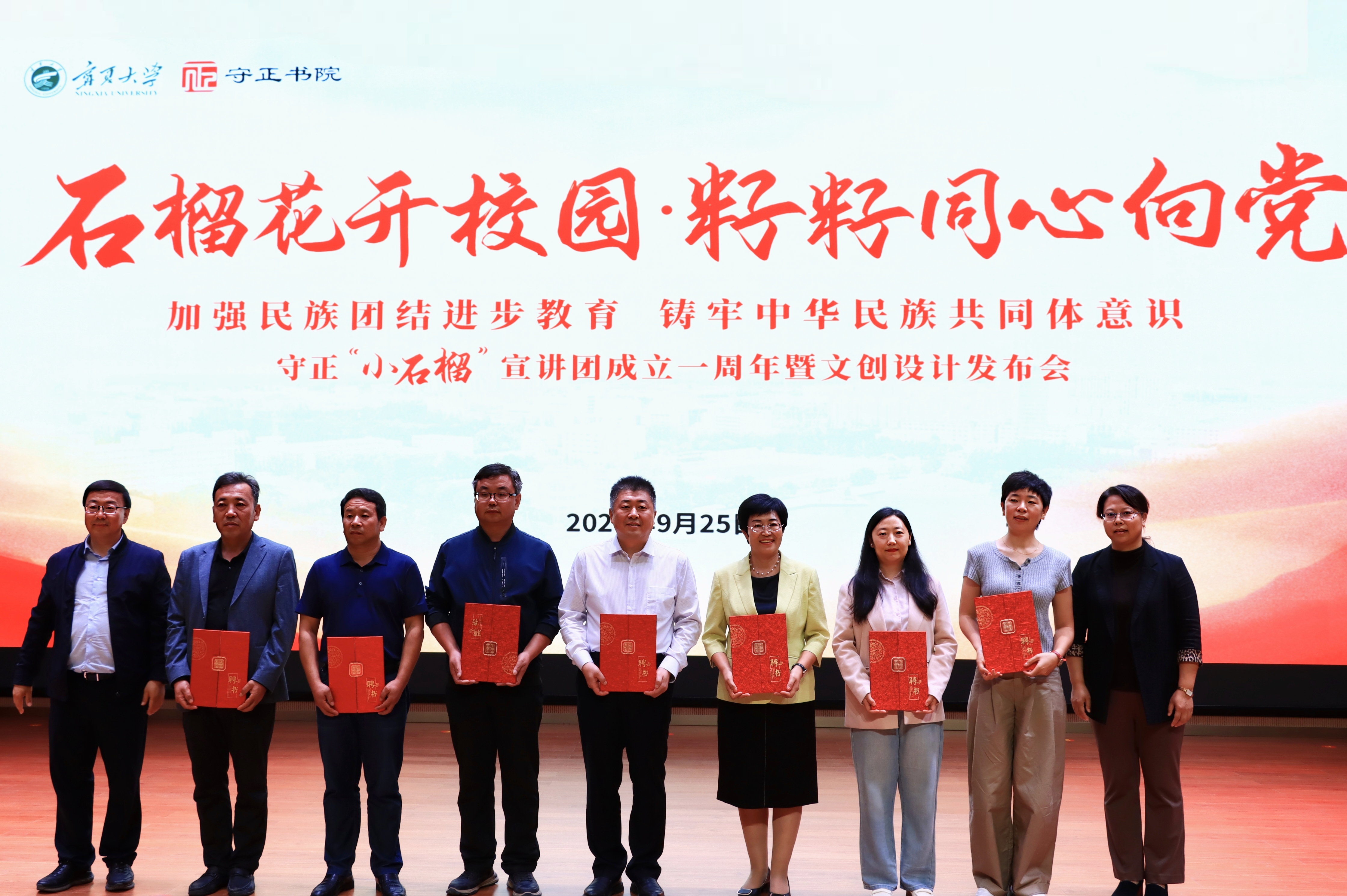 【澳门十大信誉网赌大全新闻中心讯 守正书院/文 侯文贤/图】为进一步推进书院民族团结进步创建工作,铸牢中华民族共同体意识,进一步打造和宣传守正书院“小石榴”宣讲团在铸牢中华民族共同体意识工作中的品牌特色。9月25日晚,“小石榴”宣讲团成立一周年暨文创设计发布会在贺兰山校区笃行楼报告厅举行。校党委常委、副校长黄河,党委常委、组织部部长张永丽,银川市金凤区长城中路街道长城花园社区党委书记赵耐香参加活动。发布会在庄严而热烈的氛围中拉开帷幕。守正书院党委书记、院长闫蓉介绍了“小石榴”宣讲团一年来的建设情况。她表示,过去一年,宣讲团致力于通过制度建设、特色宣讲等精品活动不断铸牢中华民族共同体意识,进一步提升了品牌影响力,为今后持续打造品牌、促进民族团结奠定了坚实的基础。与会领导为“小石榴”宣讲团文创设计揭幕,宣讲团团长程瑞晴同学进行了文创设计解读。设计以“石榴”为设计元素,巧妙融合丰富的民族文化,彰显了宣讲团的独特...