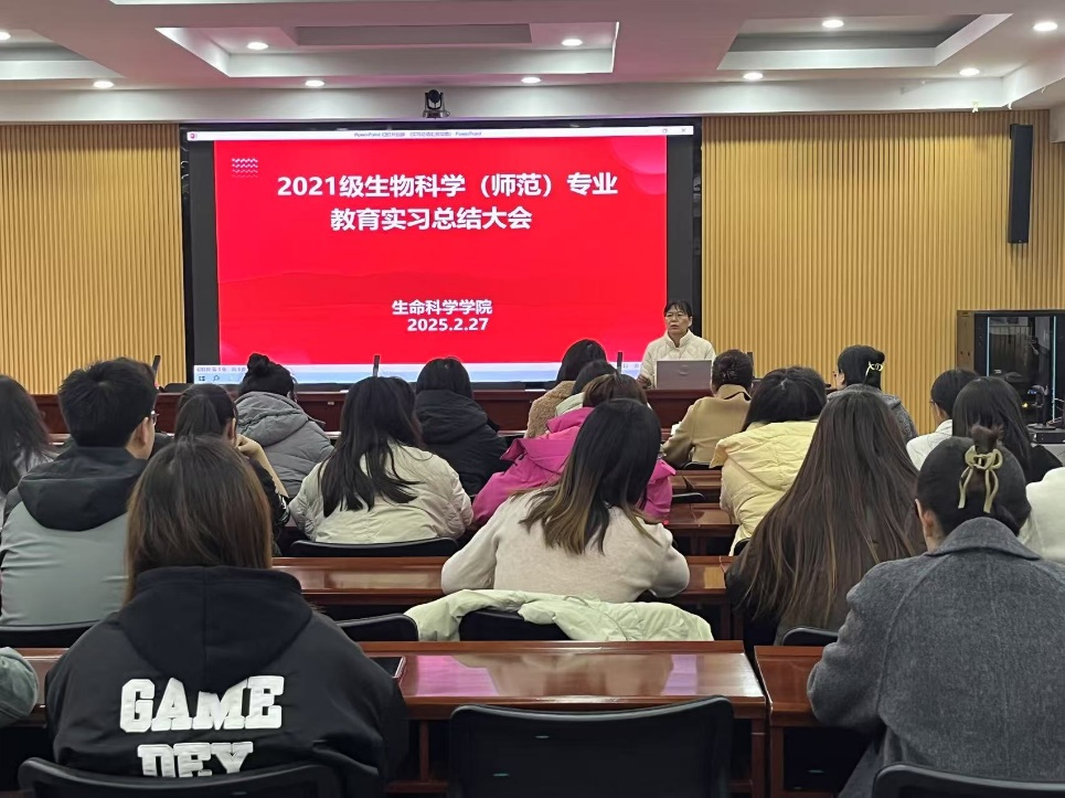 【澳门十大信誉网赌大全新闻中心讯 生命科学学院】2月27日,生命科学学院在文萃校区知本楼二楼报告厅举行了2021级生物科学(师范)专业教育实习总结大会。大会由师范教育教研室主任周续莲主持,全体实习指导教师及实习学生参会。会上,分布在银川市和石嘴山市21所中学的实习小组依次对实习工作进行了汇报。在为期一学期的实习过程中,实习生们全身心投入教育教学工作,认真听课、备课和上课,积极参与班级管理工作,虚心向指导教师请教,踊跃参加学校的各类活动。通过丰富的实践锻炼,不仅使他们的教学能力,交流沟通能力和综合素质得到了显著提升,还使他们对教师职业的内涵和教育工作的深远意义有了深刻的理解与体会。周续莲老师向同学们顺利完成实习任务表示祝贺,并高度评价了同学们在实习期间展现出的团结协作、虚心求教、自信创新的精神。她对实习小组的汇报及整体实习工作进行了全面总结。她指出,通过本次教育实习,同学们在课堂教学能力、教育技术运用能力、班...