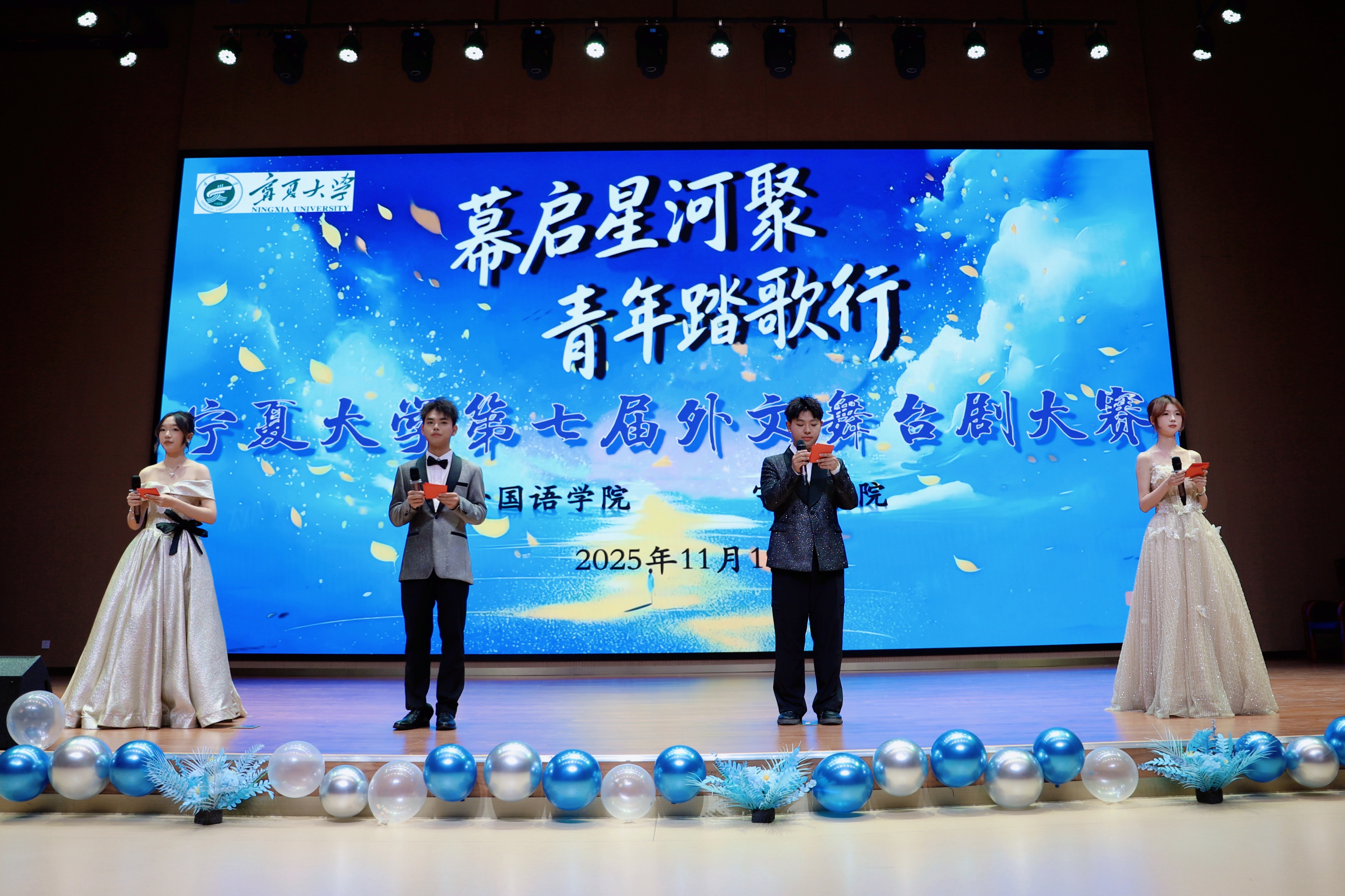 【澳门十大信誉网赌大全新闻中心讯 守正书院】幕启星河聚,青年踏歌行。为营造丰富多彩的校园文化氛围,搭建外语学习交流的平台,激发学生外语应用能力与跨文化交际热情,11月19日下午,澳门十大信誉网赌大全第七届外文舞台剧大赛在贺兰山校区笃行楼一楼报告厅举行。外国语学院党总支书记朱海燕,守正书院党委副书记赵永军、何文栋,辅导员王玮、余晓玲、王潇参加本次活动。评委由外国语学院专业老师和外教担任。赵永军致辞并宣布比赛启幕。伴着《Someon...